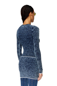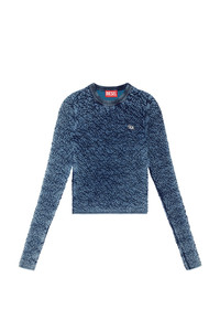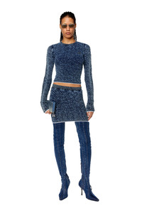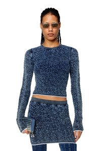 Model is wearing a size S and is 175 cm / 5'7'' Fits true to size, take your normal size. This women's crewneck jumper is knitted from indigo yarn, spun with Lycra on the reverse for a special rippled effect. A stone wash treatment imparts a subtle vintage look. The slim-fitting style is cropped at the waist and embellished with an oval D metal plate.