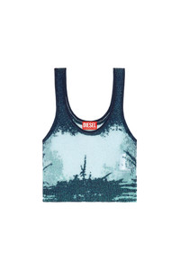 Model is wearing a size S and is 175 cm / 5'7'' Fits true to size, take your normal size. An exclusive SS24 Runway Show piece, this women’s crop top is crafted from snug-fitting ribbed knit that shimmers with metallic yarns. An indigo wash pays tribute to denim, while devoré haphazardly erodes the knit into sheerness. The effect is an alluring, trompe l'oeil wet look that captures Diesel’s subversive DNA.