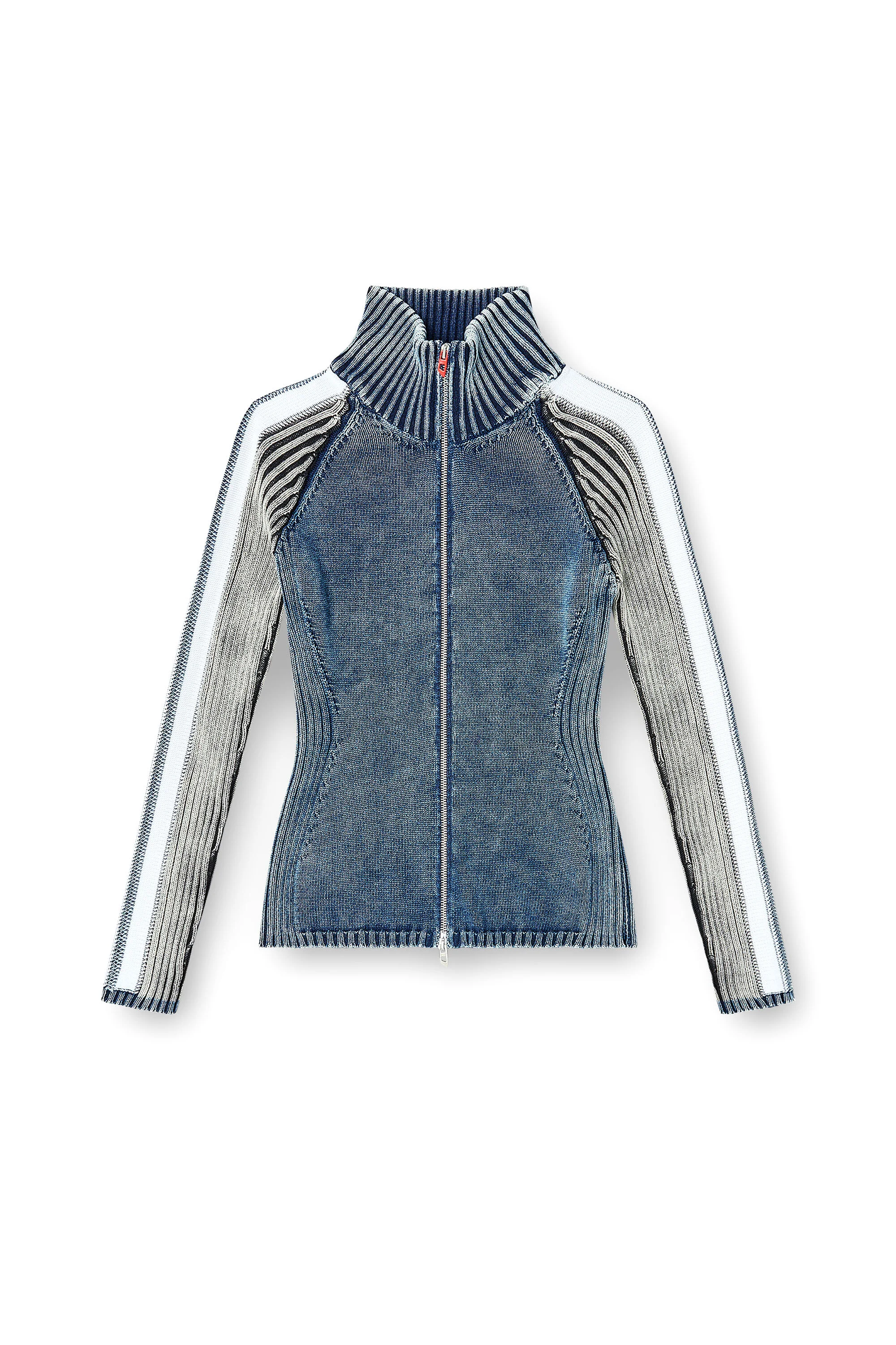 Product Description Diesel’s denim DNA and athletic edge, locked in knitwear. This women’s high-neck cardigan is knitted in part from indigo-dyed cotton and treated to echo the fade of denim. Embellished with sporty intarsia bands down the contrasting raglan sleeves, the silhouette is strategically ribbed for texture contrast and a streamlined fit. Note the D-logo pulls at the two-way zip fastening. ID: A208910WICF Size & Fit Model is wearing a size S and is 175 cm / 5'7'' Check the size chart to choose the correct size. Materials & Details Composition: 100%Cotton, Contrast 100%Polypropylene Two-way zip closure High neck