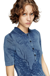 Product Description Women’s midi polo dress with three-quarter sleeves and a close-fitting silhouette. Inspired by Diesel's DNA fabric – denim, this blue knitted style is made from organic cotton dyed in real indigo and has a stonewashed finish. A bold laser-etched artwork depicting the Phoenix logo decorates the front. ID: A194790BJBS Size & Fit Model is wearing a size S and is 175 cm / 5'7'' Check the size chart to choose the correct size. Materials & Details Composition: 100%Cotton Slim fit Buttoned polo neckline