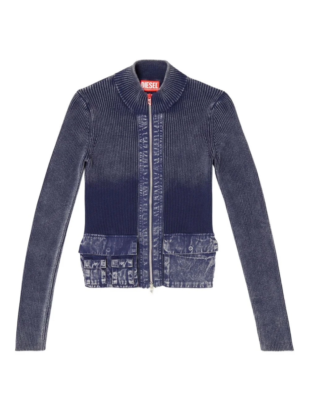 M-Melissa rib-knit denim-pockets cardigan Highlights - Blue - Rib-knit texture - Mock neck - Long-sleeves - Zip fastening - Multi-pocket detail Imported Composition Organic Cotton 100% Washing instructions Read Manufacturer Guidelines