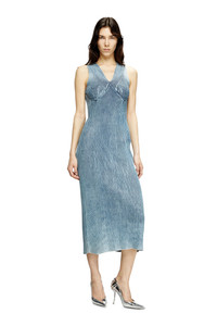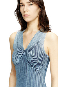 Product Description Women’s midi dress in a body-skimming ribbed knit spun from indigo denim yarn. Structured to highlight the V-neck and bust, the knit is stonewashed for a lived-in, marbled effect and amped up with a transparent Mylar foil coating that adds shine and luminosity. The metal Oval D plaque on the back is a subtle logo embellishment. ID: A189020NKCL Size & Fit Model is wearing a size S and is 175 cm / 5'7'' Check the size chart to choose the correct size. Materials & Details Composition: 100%Cotton Unlined