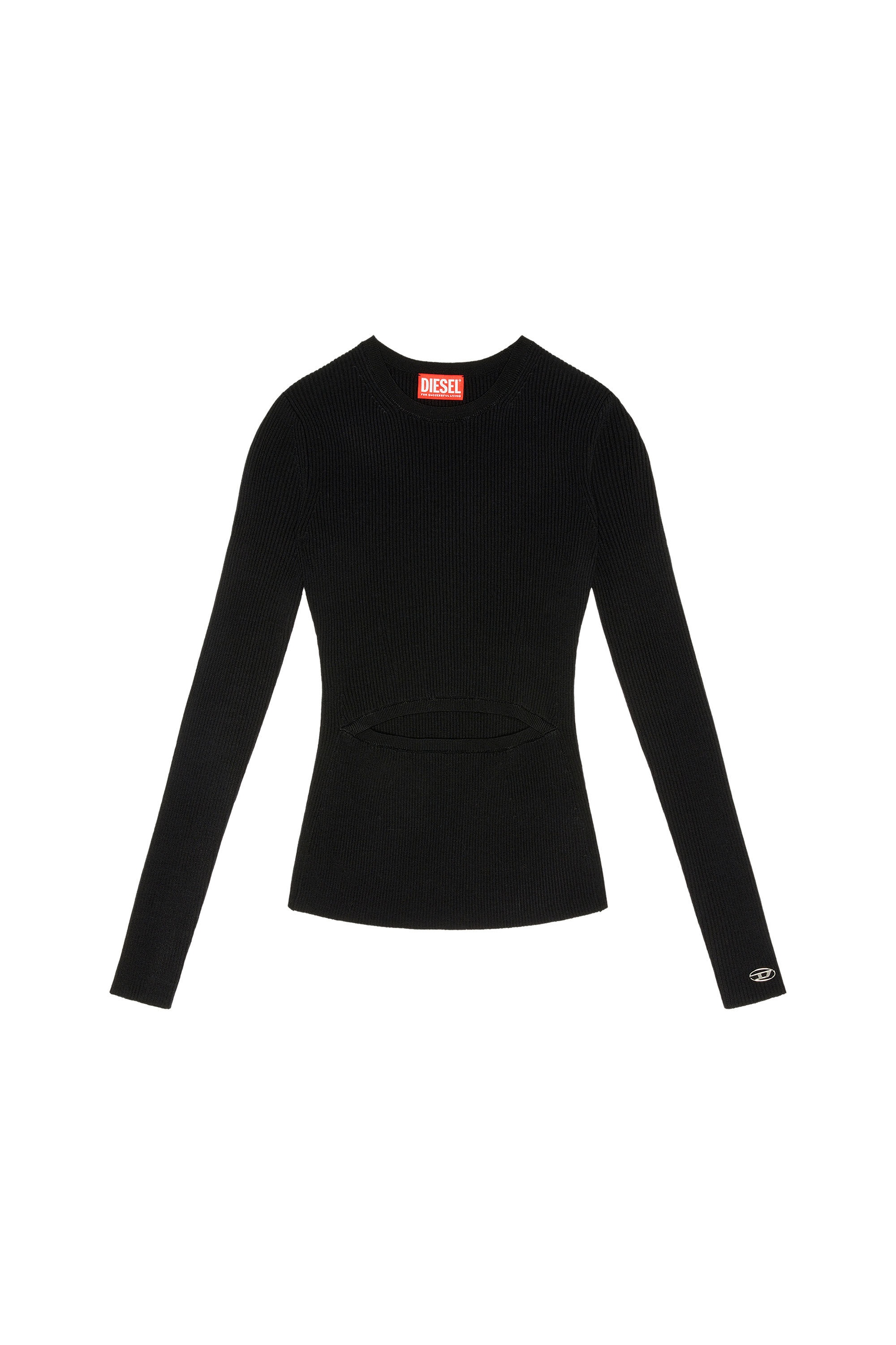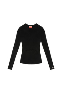 Model is wearing a size S and is 175 cm / 5'7'' Fits true to size, take your normal size. This women's long-sleeved top is characterised by a feminine cut-out motif at the slimmest part of the waist. The plated knit in viscose and wool is particularly light and fluid to the touch, while the ribbed texture ensures it fits closely to the body. A small metal oval D plaque on the left cuff completes the design.