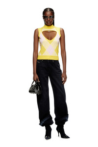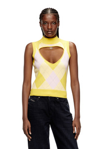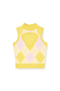 Product Description Not your ordinary argyle vest, this women’s knit top has a daring V-shaped cut-out baring the decolletage and comes with its own ‘jewellery’ – the silver Oval D plaque looks like a pendant necklace peeking from beneath the turtleneck. It’s spun from 100% responsibly sourced wool and is free of the classic diamond motif on the back. ID: A195000JLBB Size & Fit Model is wearing a size S and is 175 cm / 5'7'' Check the size chart to choose the correct size. Materials & Details Composition: 100%Wool