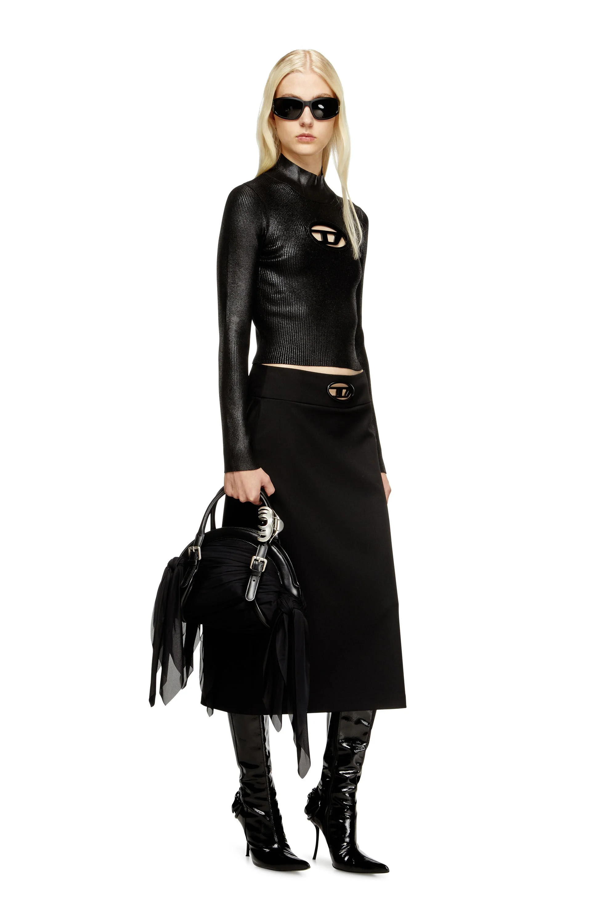 Product Description Sleek and luminous, this women’s turtleneck is a figure-hugging ribbed-knit top that shines with a transparent Mylar foil finish. It’s knitted from a soft viscose blend and embellished with metal Oval D hardware that creates a skin-baring peekaboo effect on the chest. ID: A141870QVCE Size & Fit Model is wearing a size S and is 175 cm / 5'7'' Check the size chart to choose the correct size. Materials & Details Composition: 83%Viscose-Rayon 17%Polyester Slim fit