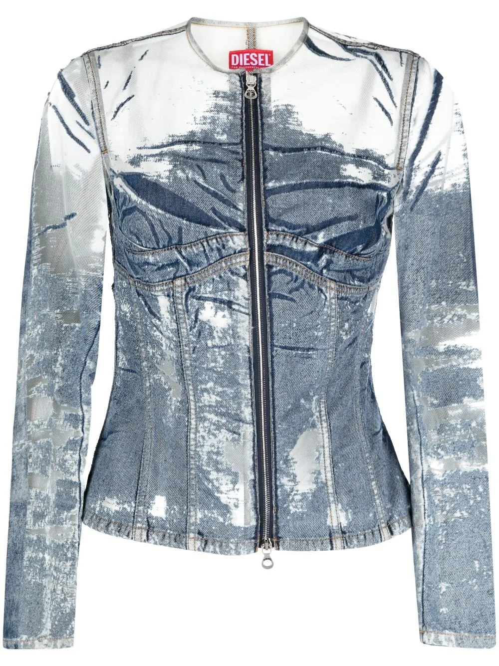 Milly denim fitted jacket Highlights - Light blue - Cotton blend - Sheer panelling - Tonal stitching - Collarless - Front zip fastening - Long sleeves - Straight hem Imported Composition Nylon 100%, Cotton 78%, Polyamide 22% SIZE & FIT Model measurements Height 5 ft 10 in(1.78 m) Bust/Chest 33.07 in(84 cm) Hips 36.61 in(93 cm) Waist 24.8 in(63 cm) FittingInformation Designed for a slim fit that sits just away from the body offering a close yet comfortable fit Made from a midweight non-stretch fabric, this piece offers minimal elasticity when worn This piece fits true to size – take your usual size Washing instructions Hand Wash