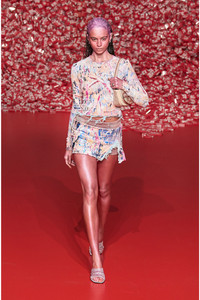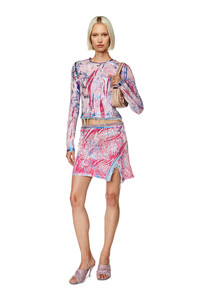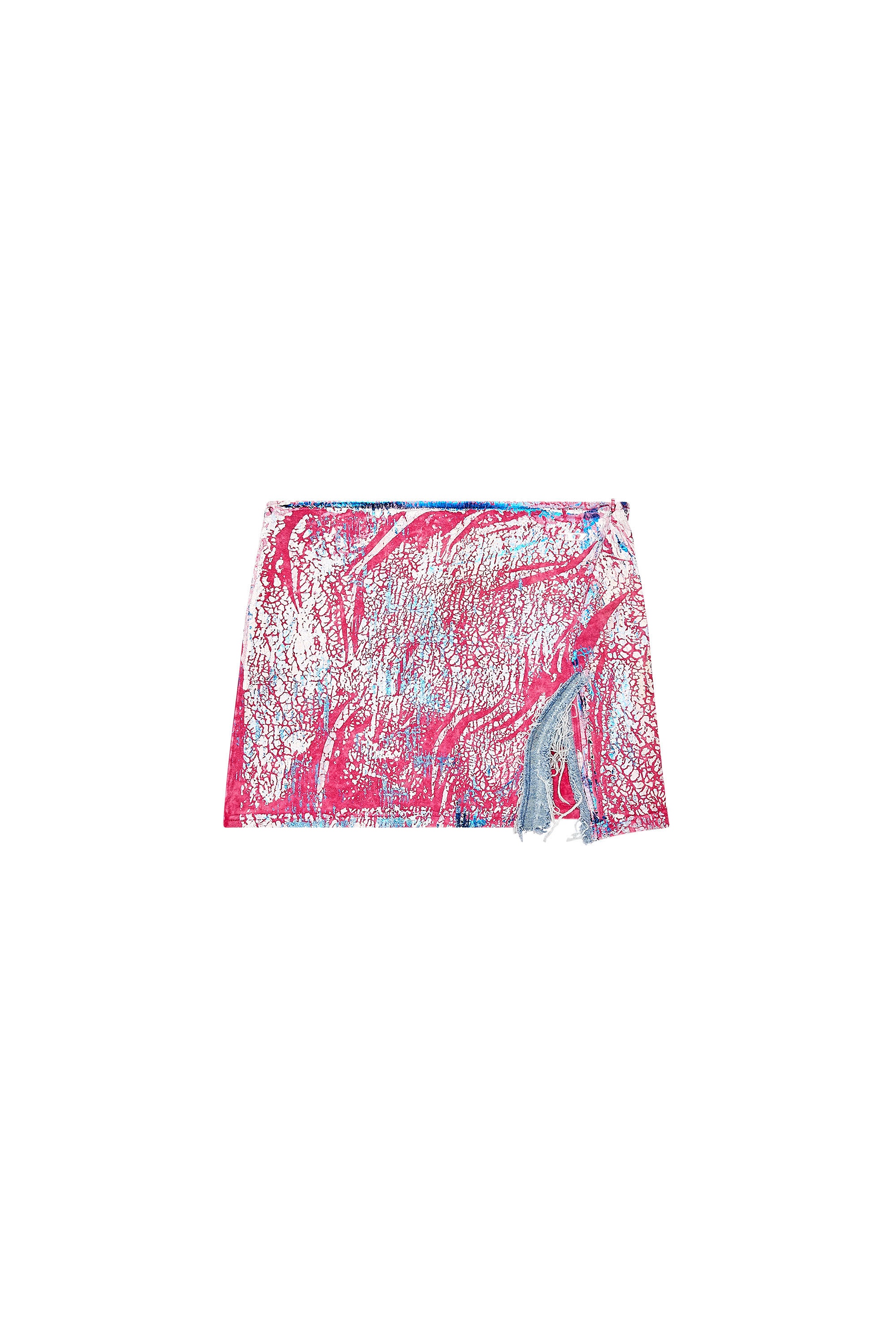 Model is wearing a size S and is 175 cm / 5'7'' Fits true to size, take your normal size. This Fall Winter 2023 Runway Show mini skirt is built from marble-washed jersey. The multicoloured design is screen-printed on in ultra-thick ink for a coated feel, elevated with a cracked finish and foil details. Because the garment is scrunched up before being printed, each one is entirely unique. A washed denim fringe slit, rhinestone-encrusted waistband with fifth pocket detail, and metal D plaque complete the design.