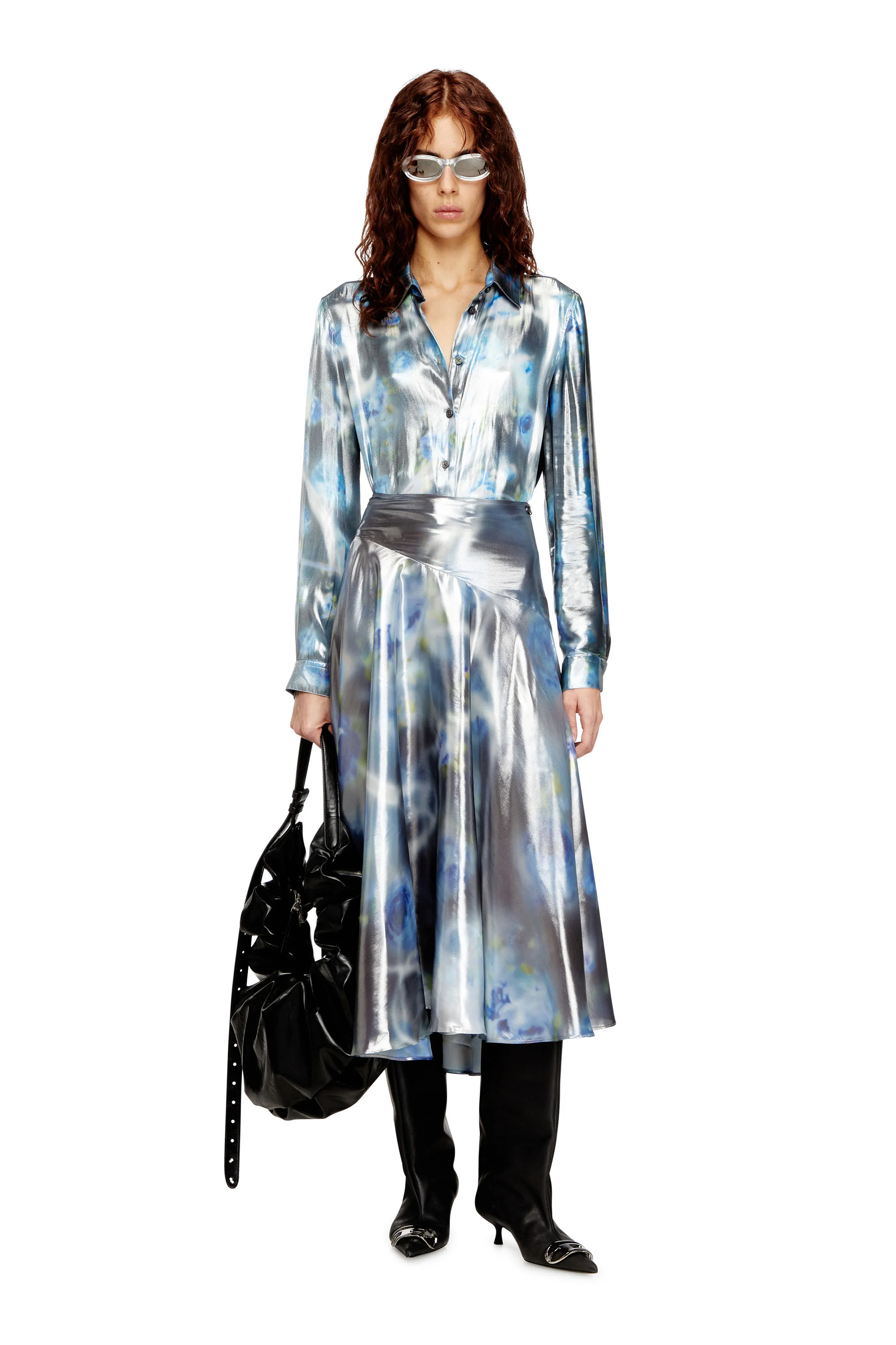 Product Description This women's full-circle skirt flares with dramatic volume. Featuring an asymmetrical panel at the waist, it's cut from foiled georgette and printed with a blurred rose motif. The fabric drapes fluidly and catches the light with a metallic, wet-look shine. The metal Oval D plaque at the front adds a signature finish. ID: A203220DMBP Size & Fit Model is wearing an IT size 40 and is 175 cm / 5'7'' Check the size chart to choose the correct size. Materials & Details Composition: 100%Polyester, Coating 100%Aluminum Invisible side zip Unlined