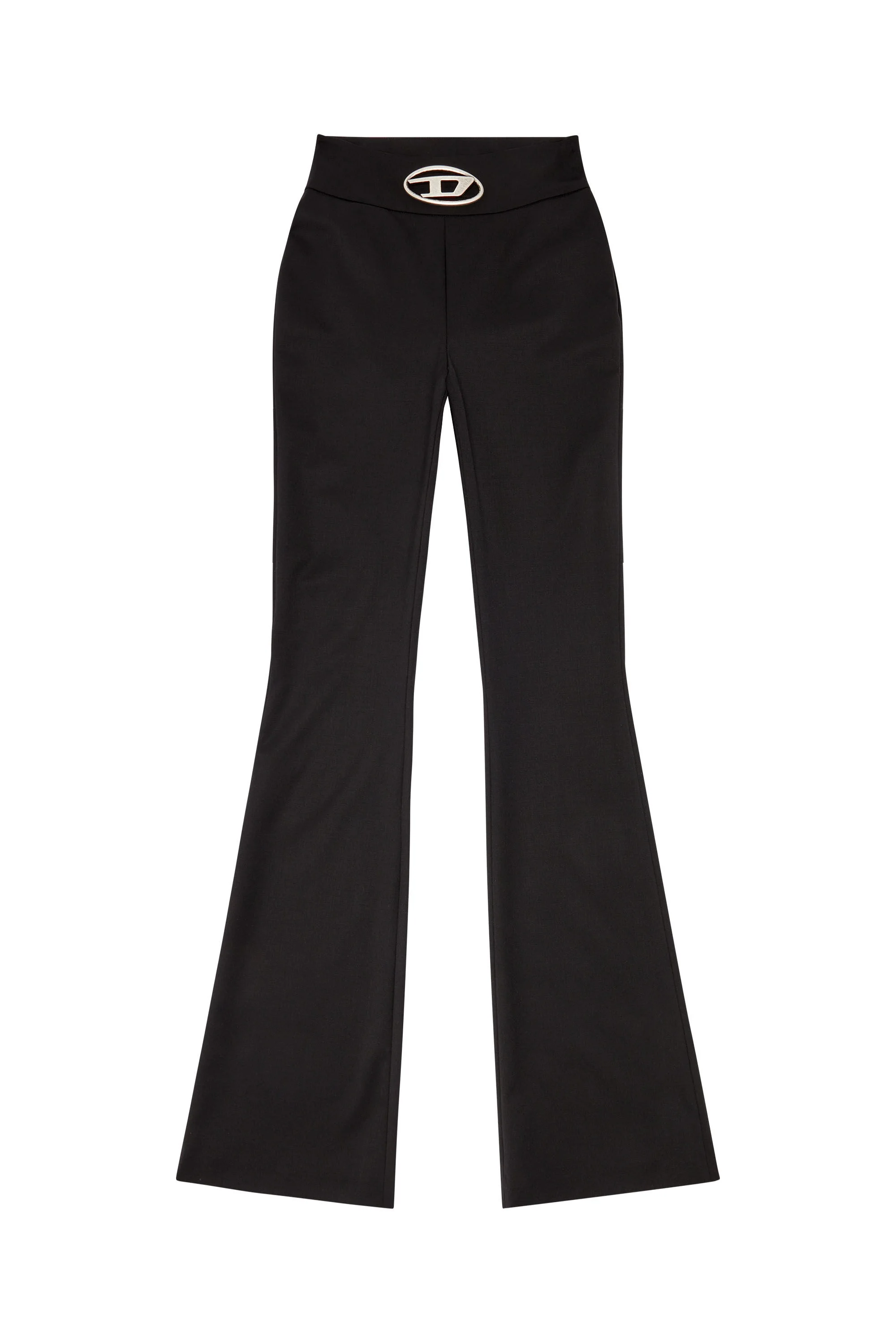 Product Description Featuring a high waist and flared leg, these women's black trousers are cut from stretchy cool wool twill for a smart look with a body-hugging fit. A wide waistband provides added support, featuring a central cut-out with a metal Oval D plaque. ID: A143900PHAL Size & Fit Model is wearing an IT size 40 and is 175 cm / 5'7'' Check the size chart to choose the correct size. Materials & Details Composition: 53%Polyester 43%Wool 4%Elastane-Spandex Slim fit Wide waistband