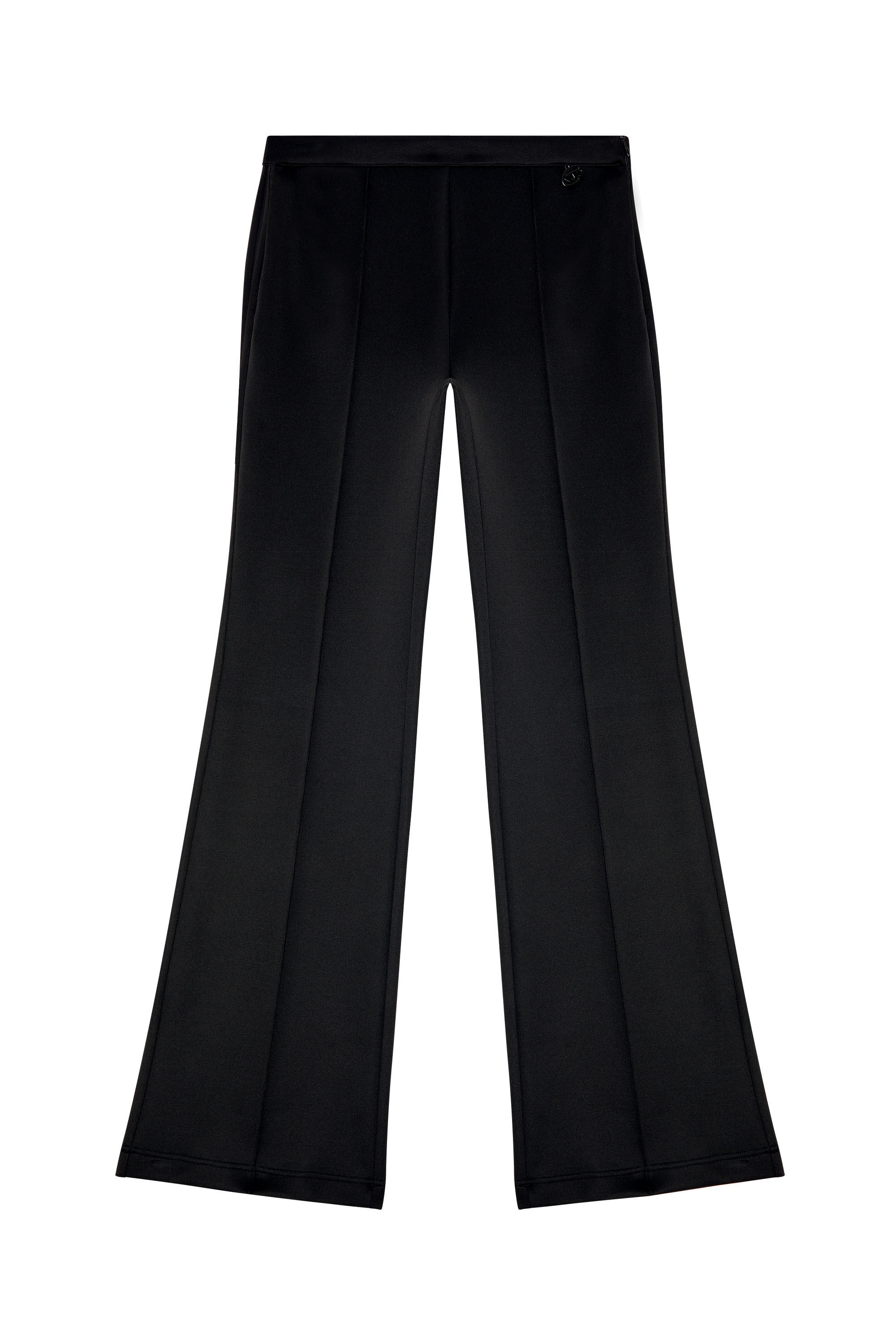 Model is wearing a size S and is 175 cm / 5'7'' Fits true to size, take your normal size. These women’s black trousers feature a special double fabric construction that uses smooth yarns on the outside and cotton on the inside. Cut for a regular fit, they’re designed with elegant front creases and bootcut hems. A tiny Oval D plaque dangles from the waist that’s cut-out at the back, revealing a flash of skin. By buying cotton products from Diesel, you’re supporting responsible cotton production through Better Cotton”.
