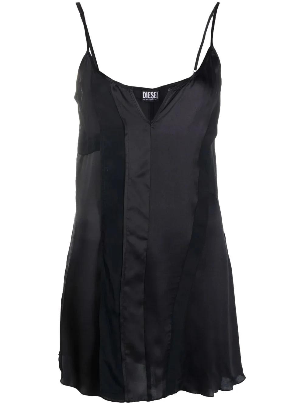 panelled satin slip dress black satin finish panelled design logo print to the front scoop neck scoop back adjustable spaghetti straps curved hem thigh-length Imported Composition Viscose 60%, Silk 40% Washing instructions Hand Wash