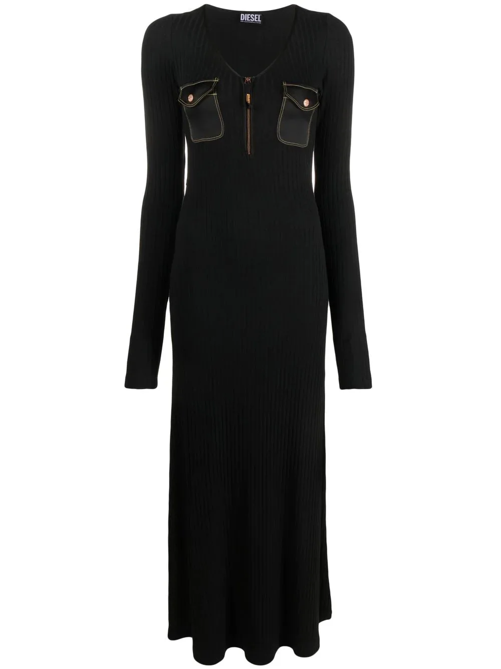 pocket-detal panelled dress black stretch-design knitted construction panelled design contrast stitching bronze-tone hardware logo-embossed buttons V-neck front zip fastening long sleeves flared hem maxi Imported Composition Viscose 95%, Spandex/Elastane 5% Washing instructions Machine Wash
