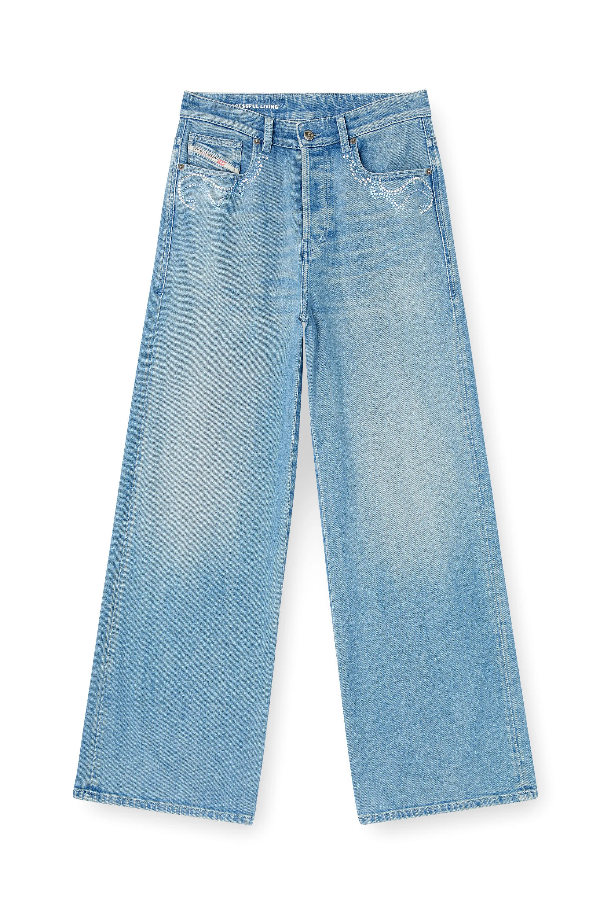 Product Description Relaxed fit with a low waist and low crotch, and extra-long wide leg. The loosest of our denim silhouettes, cut to make a drapey, oversized statement. Button fly. Crafted from fix denim in medium blue, this distinctive wash is enriched with sparkling micro stones on the front and an embroidered patch on the back pockets. ID: A2386609Q18 Size & Fit Model is wearing a size 26 and is 175 cm / 5'7'' Check the size chart to choose the correct size. Materials & Details Composition: 99%Cotton 1%Elastane-Spandex Fit: Relaxed Waist: Low Wash: Medium treated Fabric: Non-Stretch Closure: Button fly