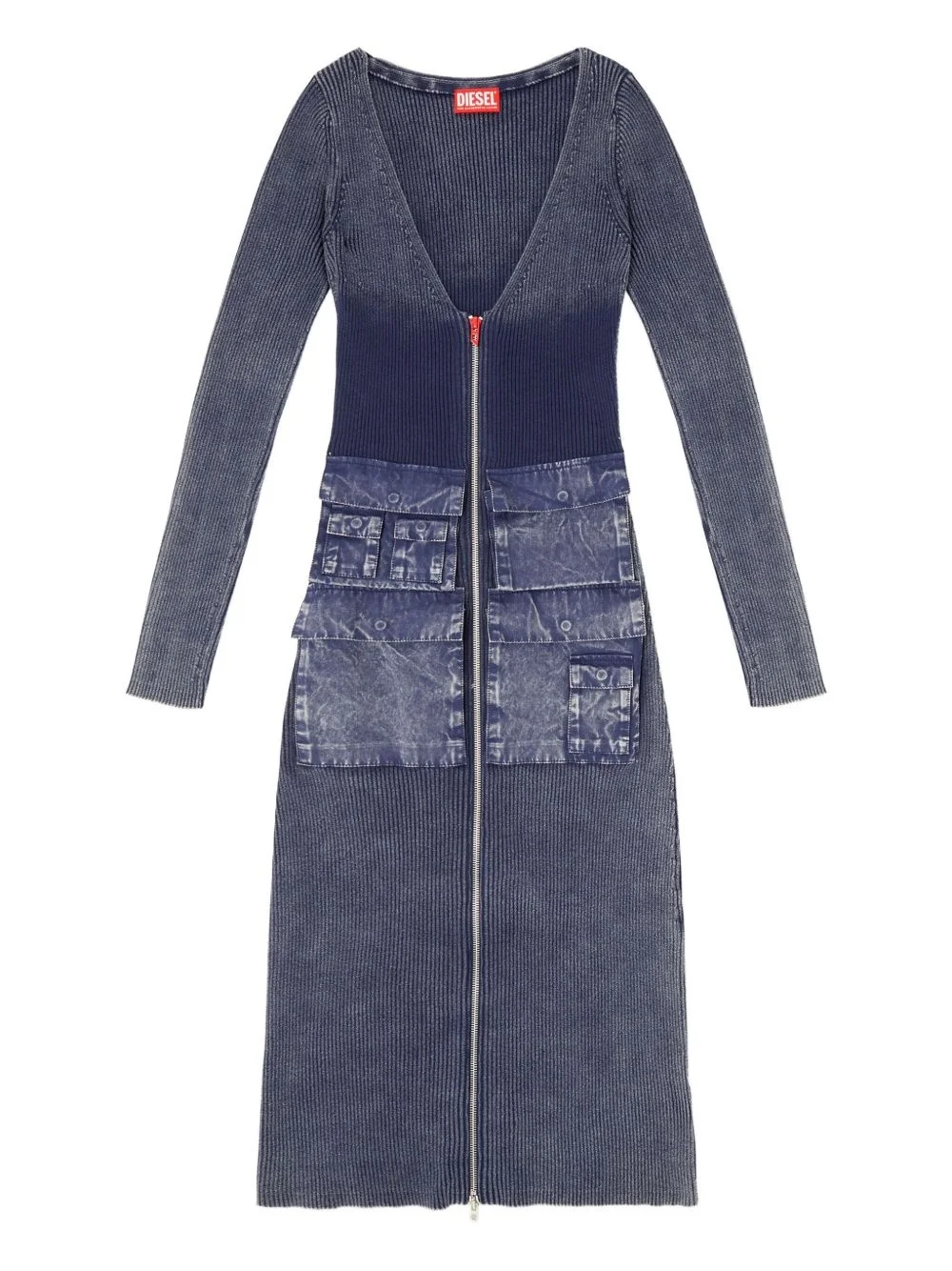 ribbed zip-front pocketed day dress Highlights - Dark-blue - Ribbed knit - Front zip fastening - Multiple pockets - Acid wash effect - Long sleeves Imported Composition Cotton 100% Washing instructions Hand Wash