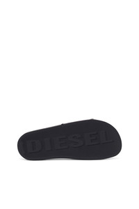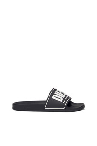 Rubber slides with contoured footbeds and gripped soles. A contrasting framed logo is embossed on the wide strap.
