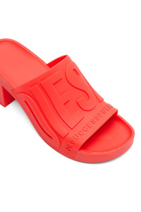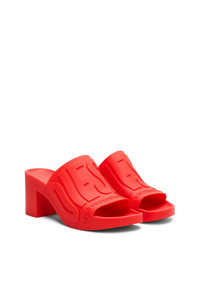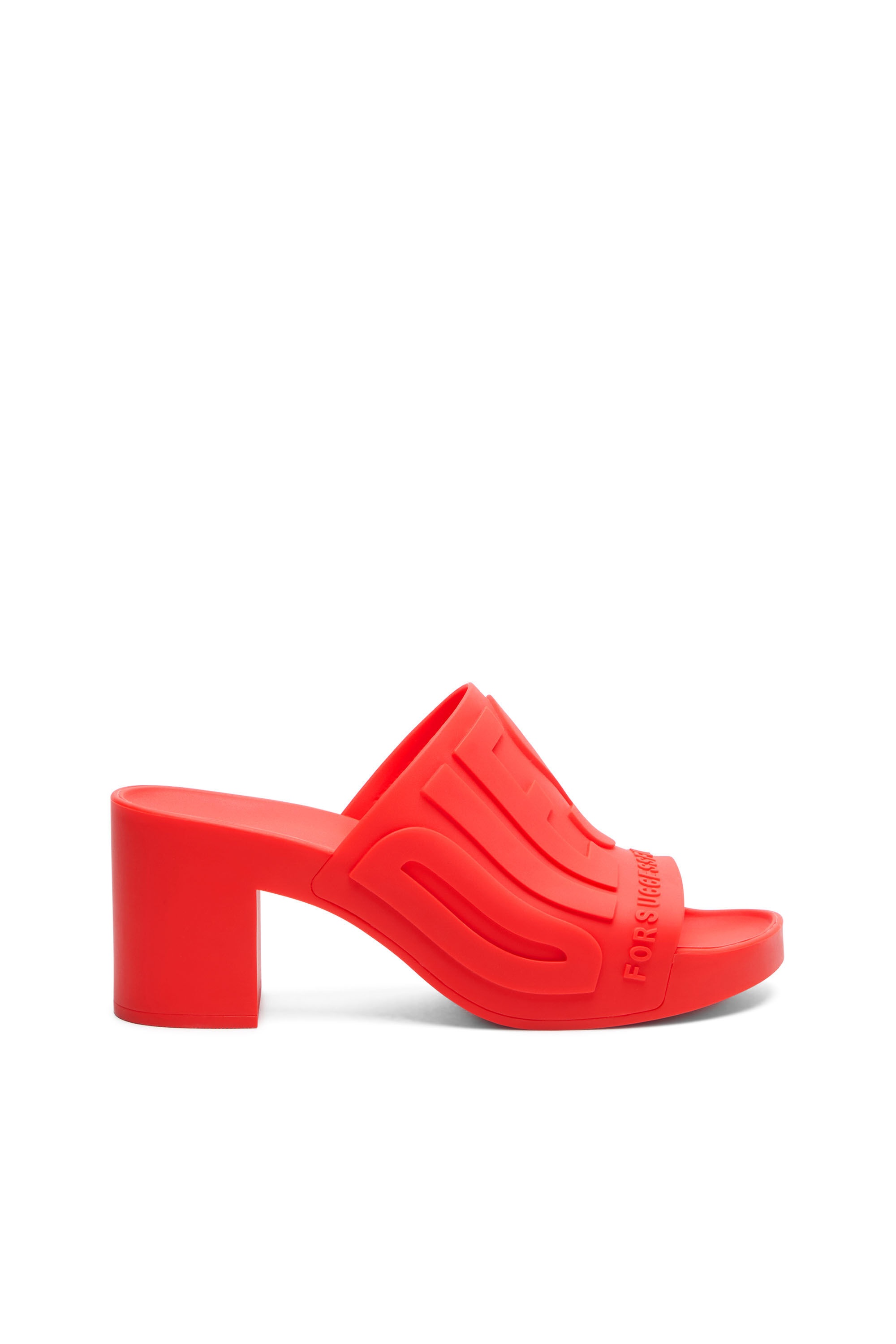 Modelled on classic '90s styles, these rubber slide sandals are elevated with a chunky block heel. Their open-toe mule silhouette is branded with a maxi embossed Diesel logo on the strap.