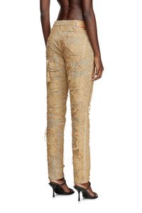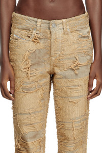 Product Description Slim fit with a low waist and slim leg. The 5 pocket silhouette with button closure is both essential and contemporary. An example of Diesel's artisanal expertise and innovative approach to denim, this Spring Summer 2025 Runway wash channels an exclusive, intentionally distressed aesthetic. The organic-cotton denim is made from a double loom jacquard weave that creates a unique net of floating threads. The garment is bleach-washed, overdyed in shades of beige, and laser-treated to highlight its distinctive craftsmanship, inspired by the concept of beauty in waste. ID: A18165007AZ Size & Fit Model is wearing a size 26 and is 175 cm / 5'7'' Check the size chart to choose the correct size. Materials & Details Composition: 100%Cotton Fit: Slim Waist: Low Wash: Treated Fabric: Non-Stretch Closure: Button fly Crotch: Regular