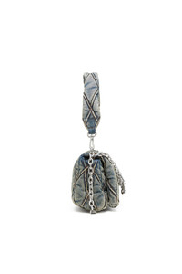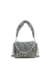 Compact women's handbag made from quilted light blue denim, topped with a matching handle. The accessory features a flap closure, an internal zipped pocket, and a metal Diesel lettering chain.
