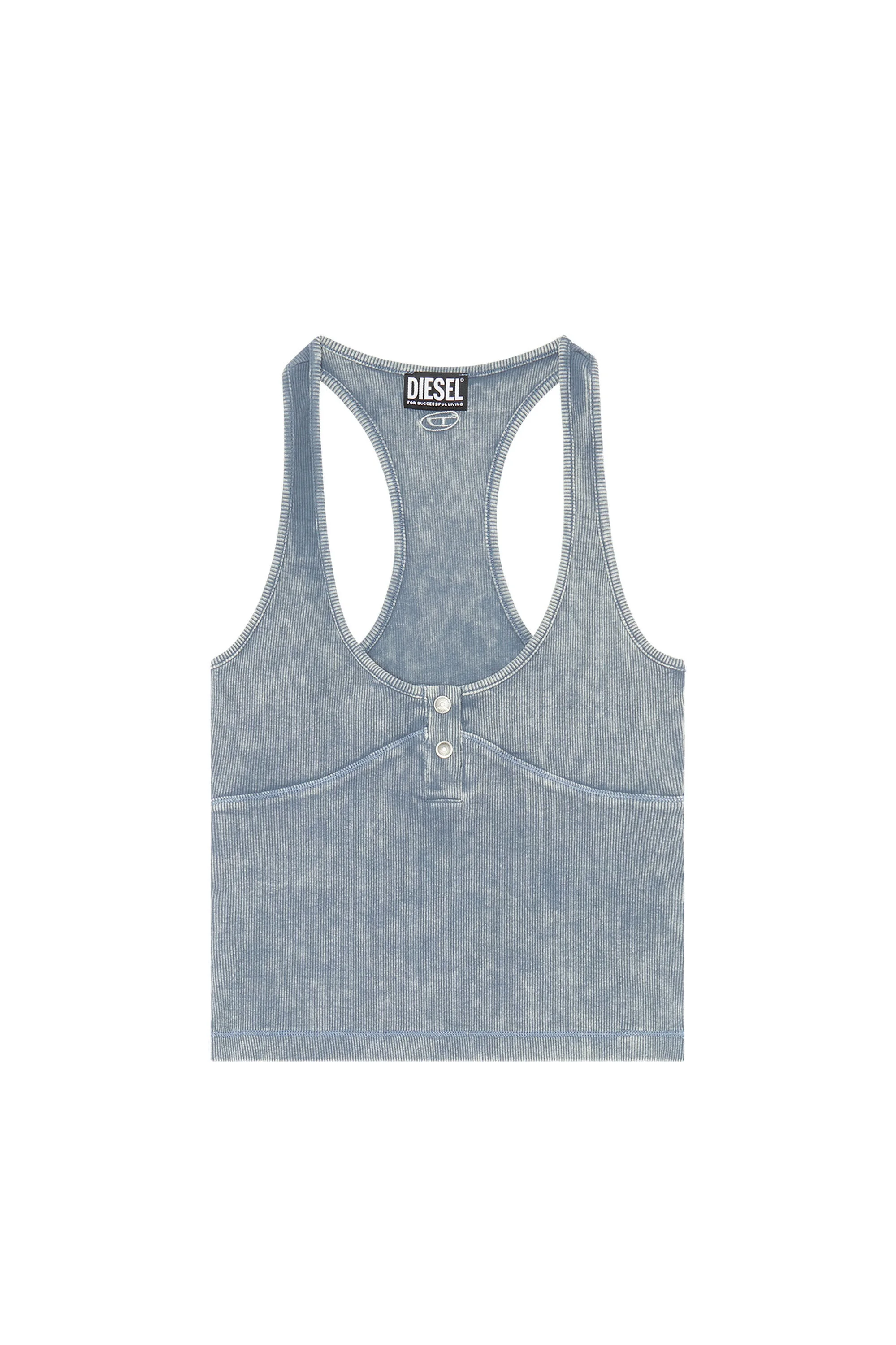 Product Description This slim-fit racerback top is cut from ribbed stretch cotton, garment dyed and washed for a faded look. A double snap button Henley opening and embroidered oval 'D' logo on the back complete this women's style. ID: A096130CJAB Size & Fit Model is wearing a size S and is 175 cm / 5'7'' Fits true to size, take your normal size. Materials & Details Composition: 97%Cotton 3%Elastane-Spandex Regular fit Snap button opening