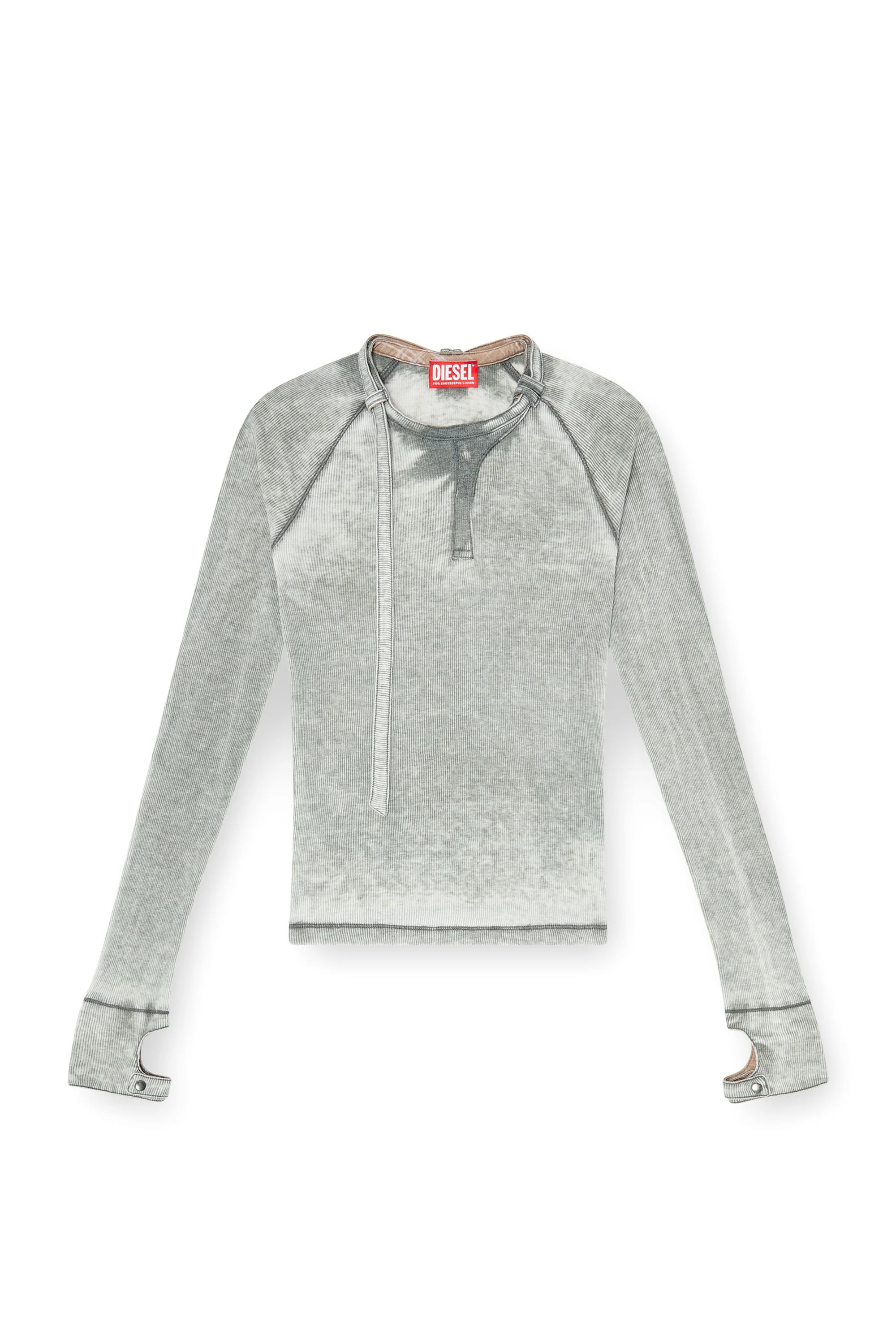 Product Description An exclusive SS26 Runway Show piece, this women’s long-sleeve top pushes an everyday essential into experimental territory. Cut from lightweight ribbed jersey, it’s specially treated to create a worn-down fade that feels lived-in from the first wear. The sleeves have snap-fastening thumbhole cuffs, while the zip neckline is anchored by a long, check-jersey-backed strap threaded through belt loops — a deconstructed biker-coded twist that telegraphs Diesel’s irreverent attitude. ID: A229280HGCQ Size & Fit Model is wearing a size S and is 175 cm / 5'7'' Check the size chart to choose the correct size. Materials & Details Composition: 65%Polyester 35%Cotton, Contrast 100%Polyester Spring Summer 2026 Runway Show Long strap at neckline (featuring a hidden zip and belt loops) Snap-button thumbhole cuffs