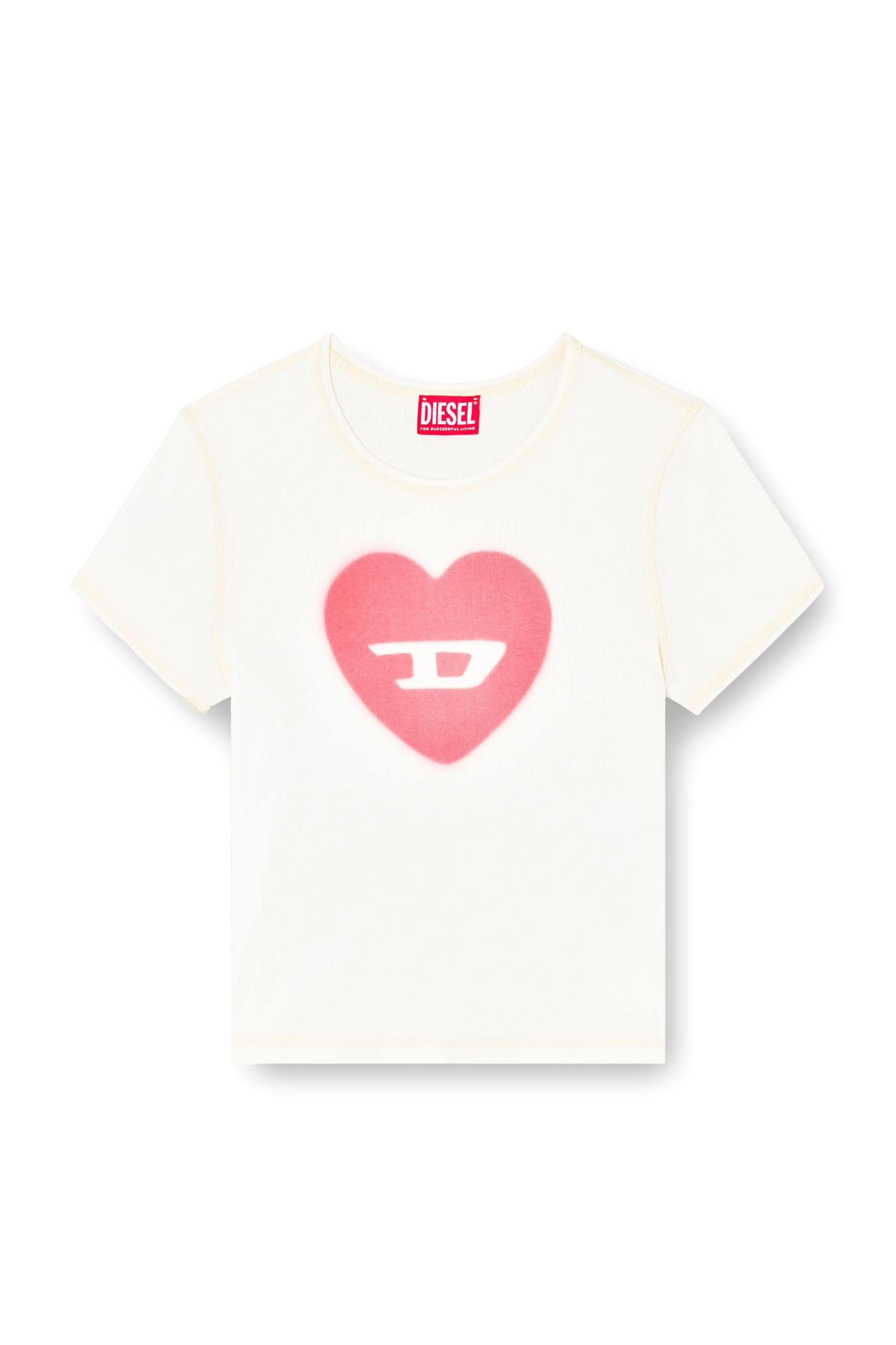 Product Description This women's tee is cut from stretch rib cotton that sits close to the body. The D heart logo is printed from the inside to create a watercolour effect. Pigment-dyed whilst inside out for a faded, worn-in look, its skinny silhouette is rounded off with contrast cover-stitching. ID: A128360SQAD Size & Fit Model is wearing a size S and is 175 cm / 5'7'' Check the size chart to choose the correct size. Materials & Details Composition: 97%Cotton 3%Elastane-Spandex By buying cotton products from Diesel, you’re supporting responsible cotton production through "Better Cotton”. Super-slim fit