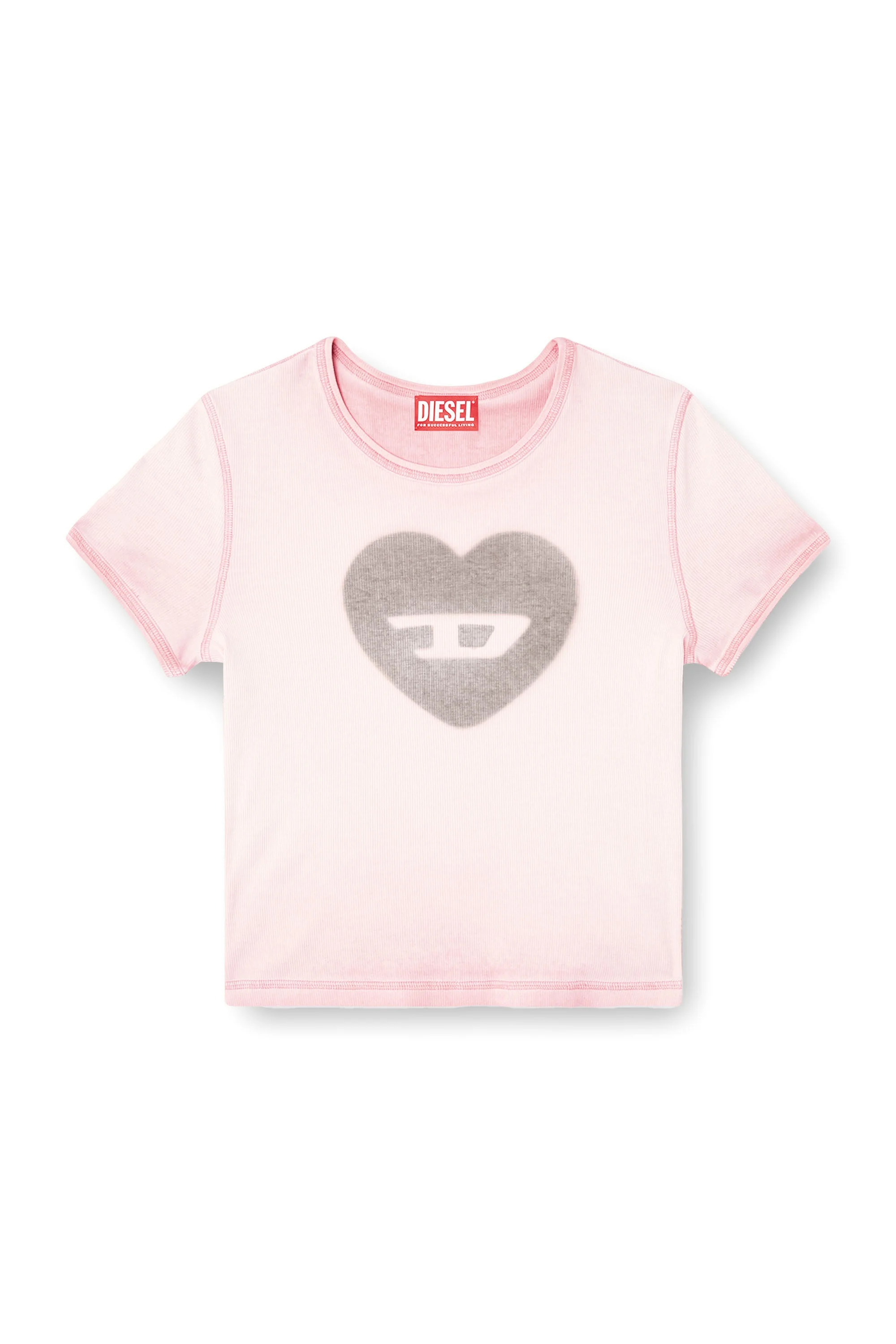 Product Description This women's tee is cut from stretch rib cotton that sits close to the body. The D heart logo is printed from the inside to create a watercolour effect. Pigment-dyed whilst inside out for a faded, worn-in look, its skinny silhouette is rounded off with contrast cover-stitching. ID: A128360SQAD Size & Fit Model is wearing a size S and is 175 cm / 5'7'' Check the size chart to choose the correct size. Materials & Details Composition: 97%Cotton 3%Elastane-Spandex By buying cotton products from Diesel, you’re supporting responsible cotton production through "Better Cotton”. Super-slim fit
