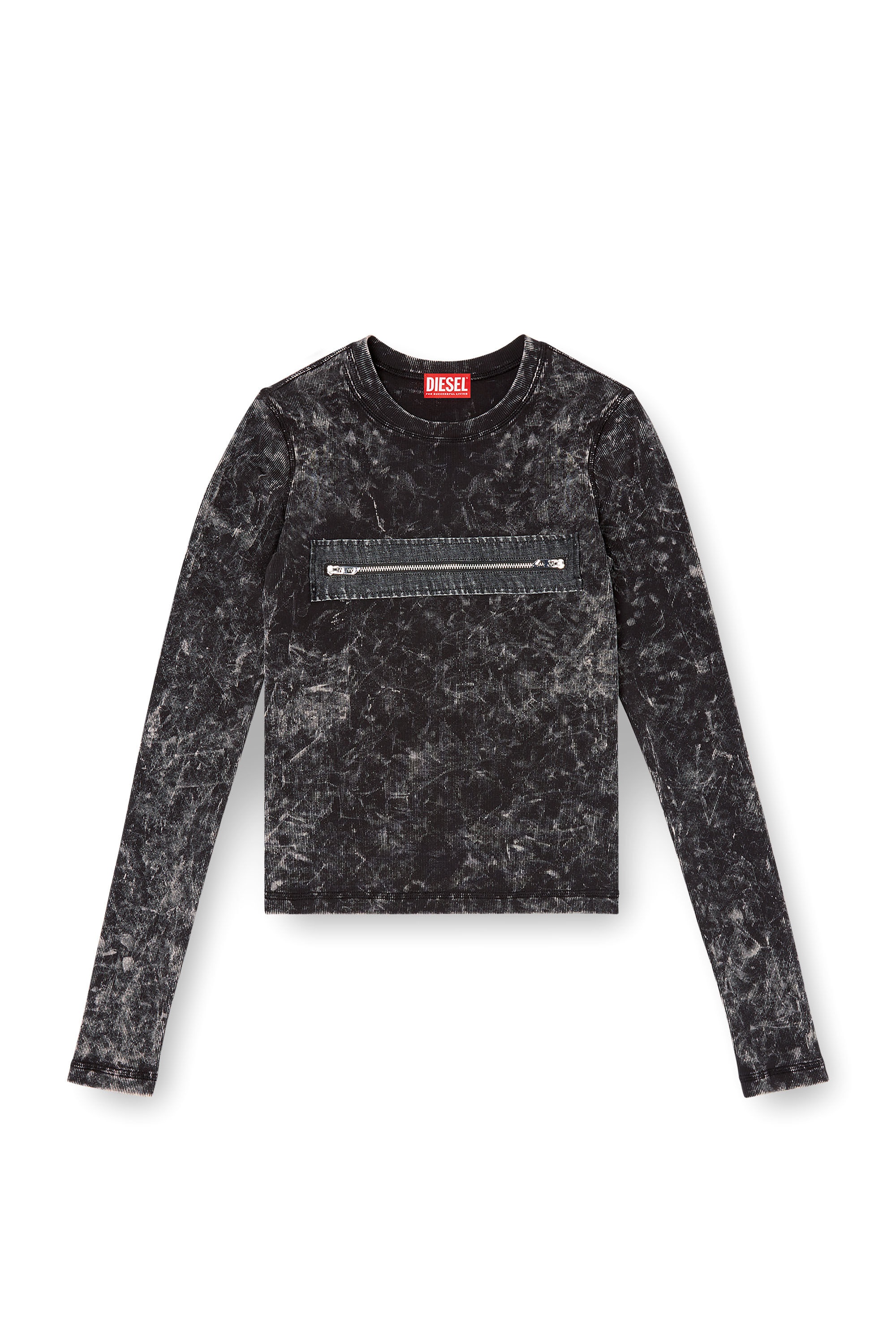Product Description This women's long-sleeve top is specially treated to recall the crinkled, marbled fade of acid-wash denim. Made from finely ribbed stretch jersey using organic cotton, it has a regular fit and utilitarian accent – the denim-trimmed two-way zip placed over the decolletage opens to show flashes of skin. External overlock stitching adds an inside-out feel. ID: A166280QMAU Size & Fit Model is wearing a size S and is 175 cm / 5'7'' Check the size chart to choose the correct size. Materials & Details Composition: 90%Cotton 10%Elastane-Spandex, Application 100%Cotton Regular fit Two-way zip fastening chest cut-out