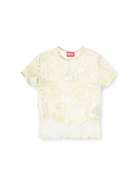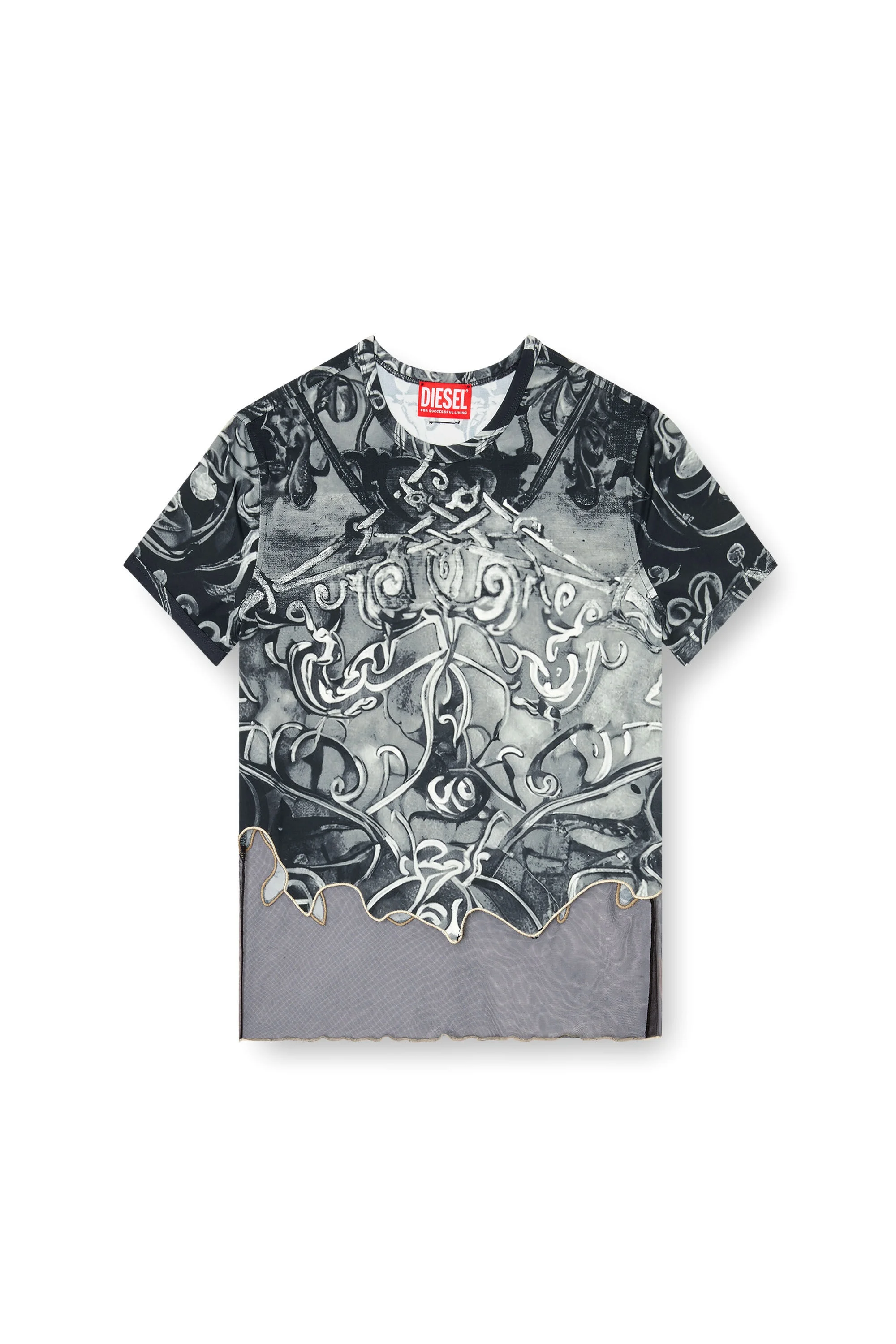 Product Description This women's tee is cut to a slim fit from printed recycled nylon, showcasing Heraldic artwork with a wallpaper vibe. A hem insert reveals the skin in see-through tulle, cut with a doodled line edged with cord embroidery. ID: A184180BJBT Size & Fit Model is wearing a size S and is 175 cm / 5'7'' Check the size chart to choose the correct size. Materials & Details Composition: 77%Polyamide-Nylon 23%Elastane-Spandex, Contrast 100%Polyamide-Nylon Sim fit