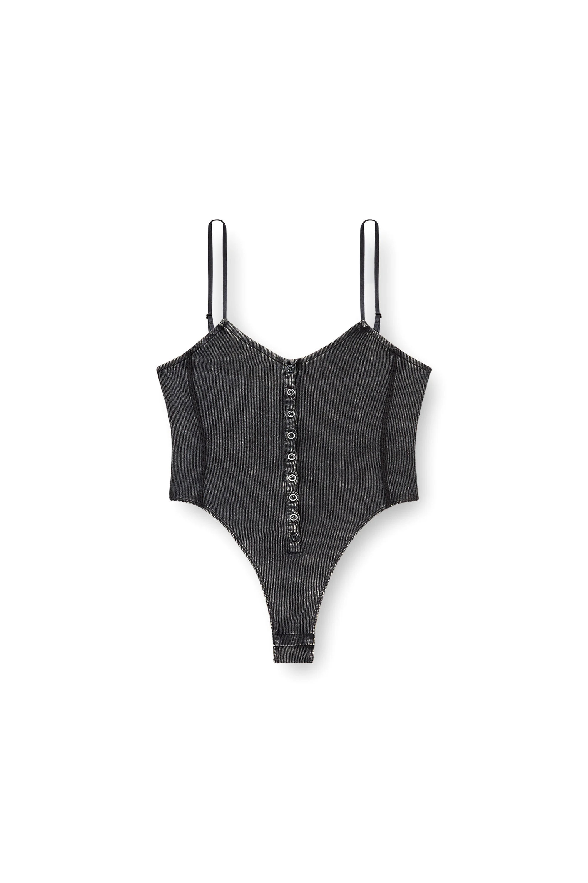 Product Description Women’s thong bodysuit in flexible ribbed jersey. Made from a blend of ECOVERO™ viscose and stretch, this style features adjustable spaghetti straps, buttons at the front and a cool marled fade for a lived-in effect. An embroidered Oval D logo hallmarks the back. ID: A203600DCCQ Size & Fit Model is wearing a size S and is 175 cm / 5'7'' Check the size chart to choose the correct size. Materials & Details Composition: 95%Viscose-Rayon 5%Elastane-Spandex Skinny fit High-cut leg Slim adjustable straps Partial button opening at front Snap buttons at base