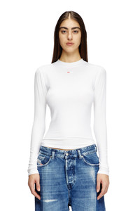 Product Description This women's mock-neck top is made from stretch rib jersey that contains Ecovero viscose for a skinny fit. Long-sleeved design with micro D initial embroidery on the front. ID: A103990BLAN Size & Fit Model is wearing a size S and is 175 cm / 5'7'' Check the size chart to choose the correct size. Materials & Details Composition: 95%Viscose-Rayon 5%Elastane-Spandex Skinny fit