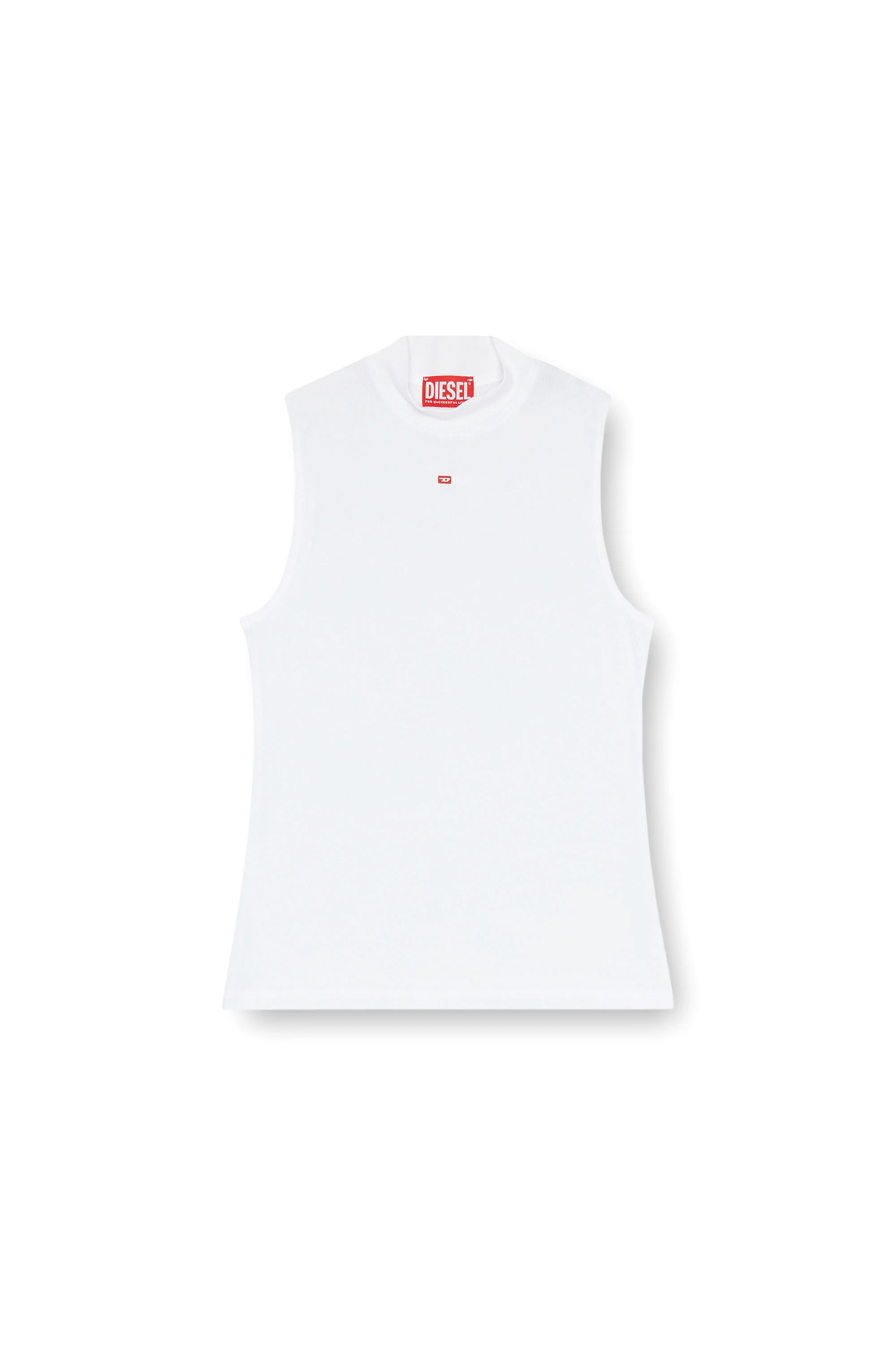 Product Description This women's tank top is cut from stretch rib jersey containing Ecovero viscose fibres. Its skinny-fit silhouette flaunts a mock neck and is embroidered with a micro D initial logo on the front. ID: A103970BLAN Size & Fit Model is wearing a size S and is 175 cm / 5'7'' Check the size chart to choose the correct size. Materials & Details Composition: 95%Viscose-Rayon 5%Elastane-Spandex Skinny fit