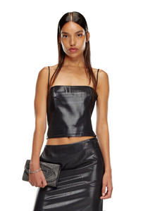 Product Description Showcasing Diesel's alternative tailoring aesthetic, this women's slim-fit camisole is cut from pinstripe technical cool wool. A heat-pressed foil coating on the front creates a shiny effect, embellished with a tonal Oval D plaque. The thin spaghetti straps meet in the middle at the back. ID: A139890IPAA Size & Fit Model is wearing an IT size 40 and is 175 cm / 5'7'' Check the size chart to choose the correct size. Materials & Details Composition: 52%Polyester 43%Virgin Wool 5%Elastane-Spandex, Coating 100%Polyurethane Slim fit Concealed side zip closure Adjustable straps