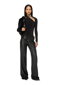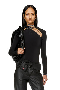 Model is wearing a size S and is 175 cm / 5'7'' Fits true to size, take your normal size. Seen on the Fall Winter 2023 Runway Show, this women's bodysuit shows an edgy interpretation of the Oval D logo, rendered as a polished metallic choker weaved through the gathered halter neckline. The snug silhouette is cut from smooth and flexible double-knit fabric, framed by daring slits on the front and back.