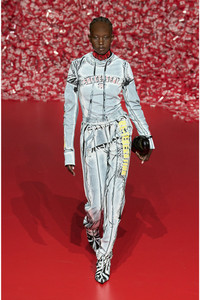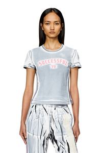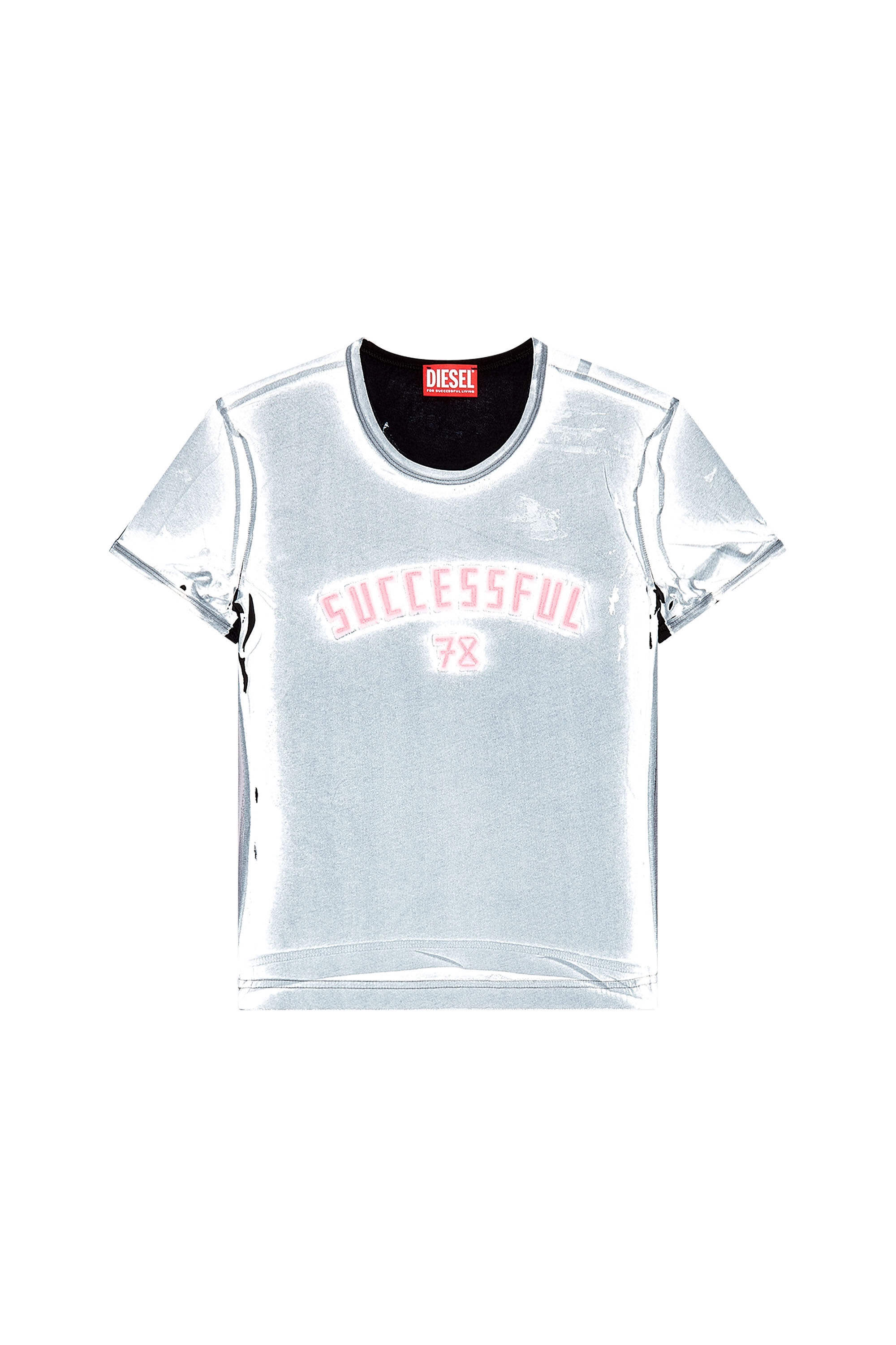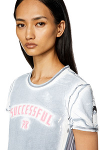 Model is wearing a size S and is 175 cm / 5'7'' Fits true to size, take your normal size. Women’s fitted T-shirt from the Fall Winter 2023 Runway Show. Cut from lightweight cotton jersey, this specially printed top has a light faded hue offset by streaks of black to appear creased and cracked. The printed side bands and neatly appliquéd SUCCESSFUL slogan across the chest complete this exclusive look.