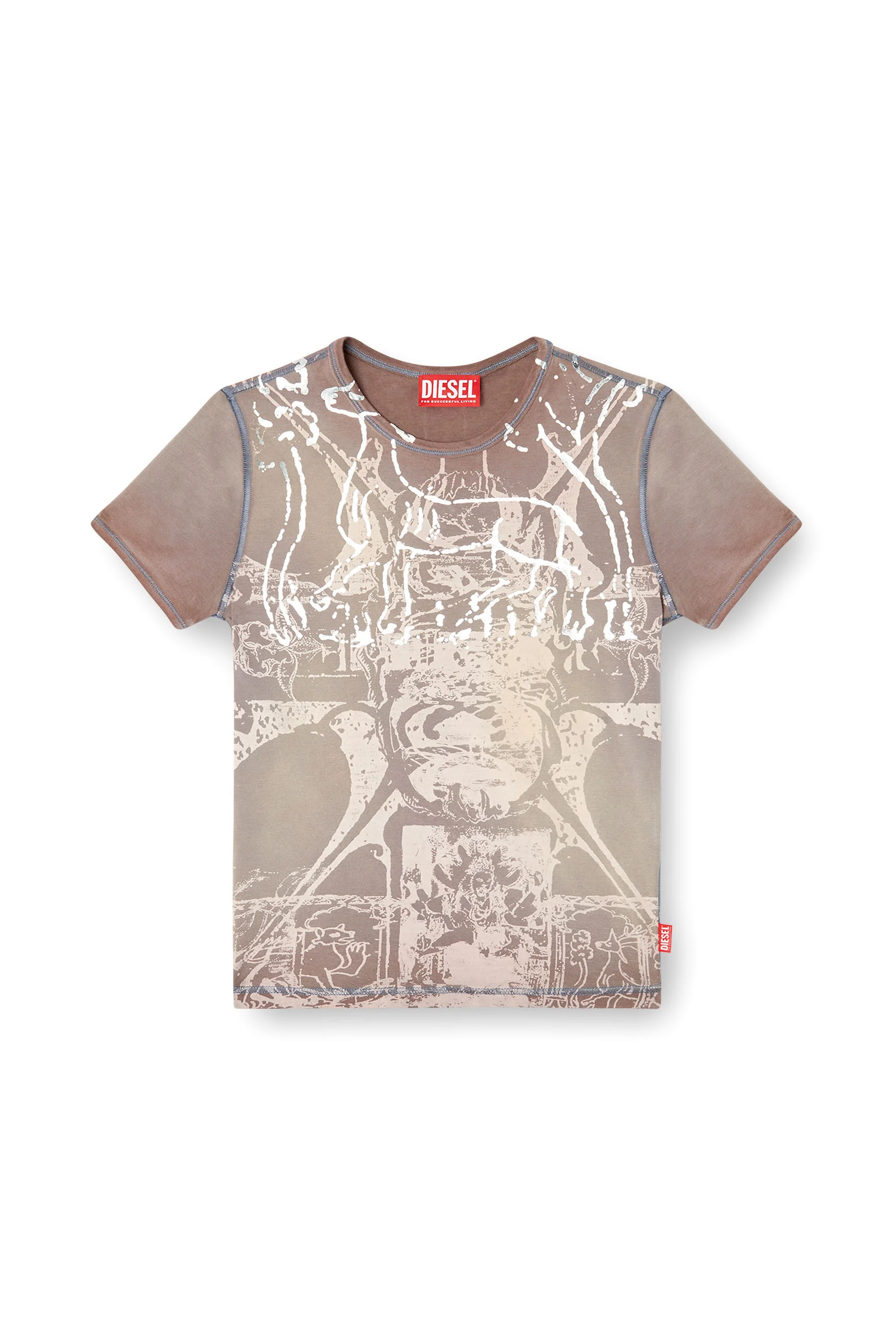 Product Description This women's T-shirt is digitally printed with medieval-esque artwork, enriched with shiny foil detailing at the top. Its stretchy organic cotton jersey construction sits close to the body, dyed from the inside to impart a faded look. ID: A195300DEBZ Size & Fit Model is wearing a size S and is 175 cm / 5'7'' Check the size chart to choose the correct size. Materials & Details Composition: 95%Cotton 5%Elastane-Spandex, Rib 98%Cotton 2%Elastane-Spandex Slim fit