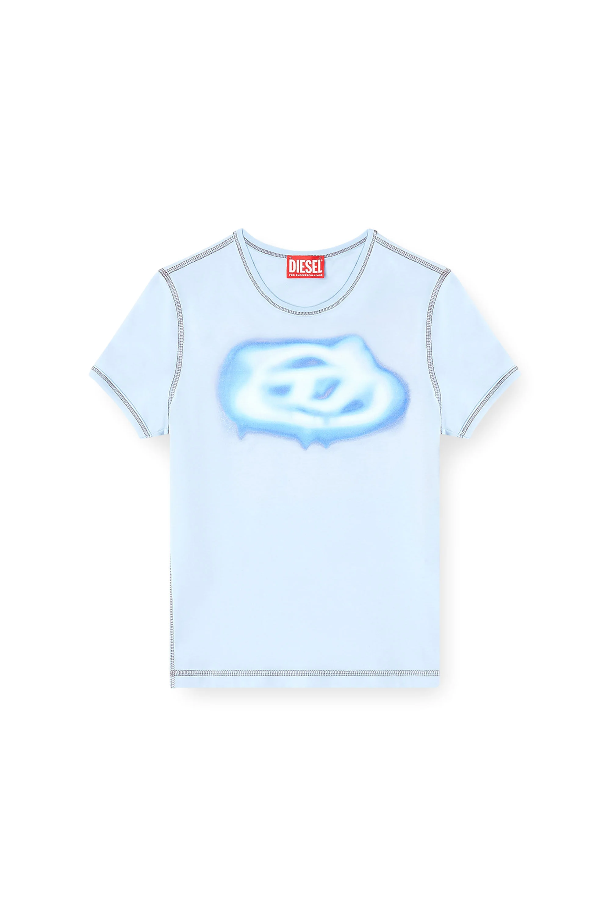 Product Description Women's slim-fit T-shirt with a crew neck and short sleeves, made from stretch cotton jersey with organic cotton. Outlined by contrast cover stitching along the seams, this tee features an Oval D logo print with a distinctive paint-like look. ID: A204970QHHA Size & Fit Model is wearing a size S and is 175 cm / 5'7'' Check the size chart to choose the correct size. Materials & Details Composition: 95%Cotton 5%Elastane-Spandex, Rib 98%Cotton 2%Elastane-Spandex Crew neck Slim fit Contrast coverstitching Diesel label on left side seam