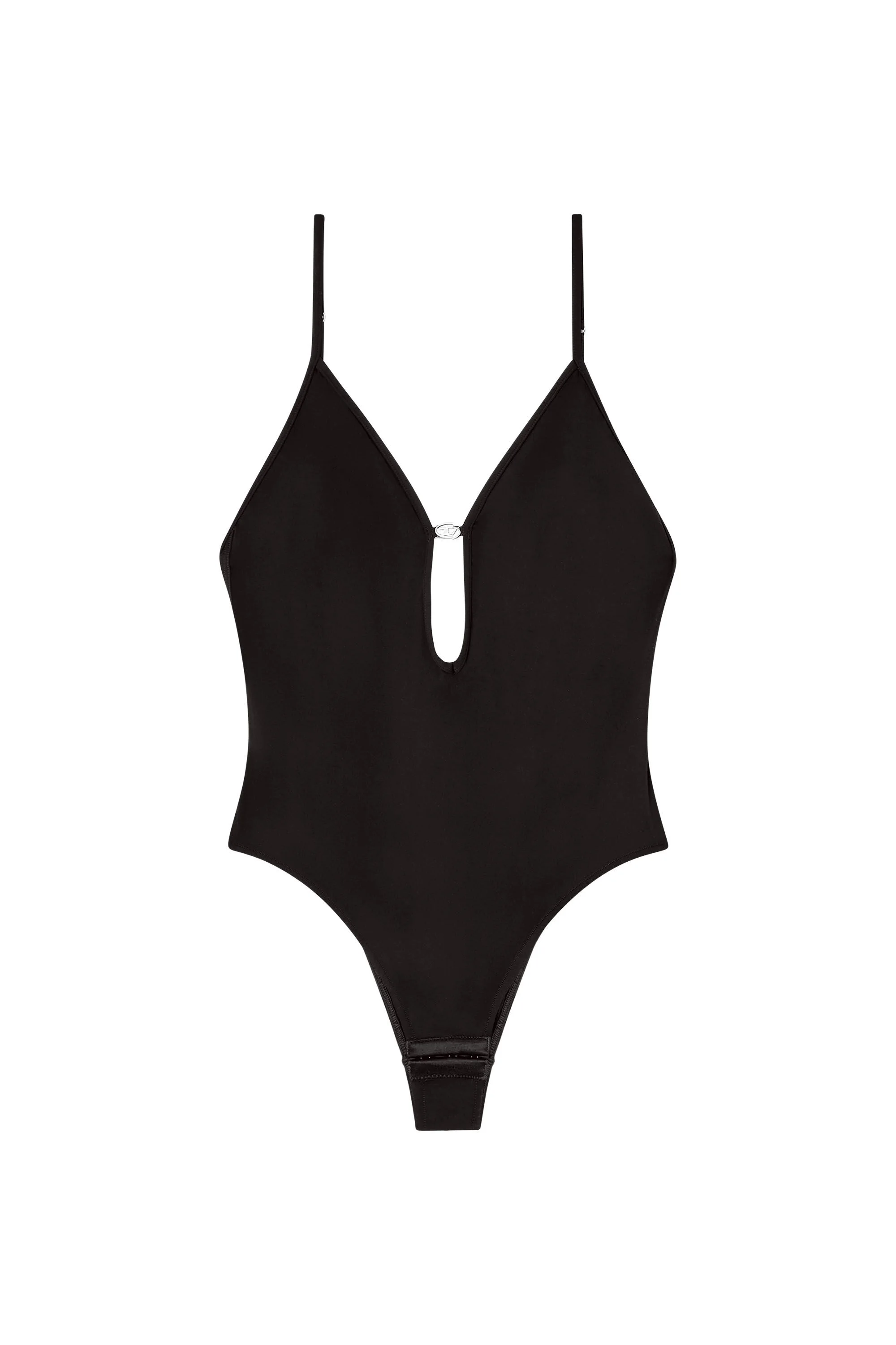 Product Description A low-back style, this women's bodysuit is crafted from super-soft black microfibre. Its deep V-front is secured with a tonal metal Oval D plaque. ID: A152250IKBN Size & Fit Model is wearing a size S and is 175 cm / 5'7'' Check the size chart to choose the correct size. Materials & Details Composition: 85%Polyamide-Nylon 15%Elastane-Spandex, Braces 81%Polyamide-Nylon 19%Elastane-Spandex