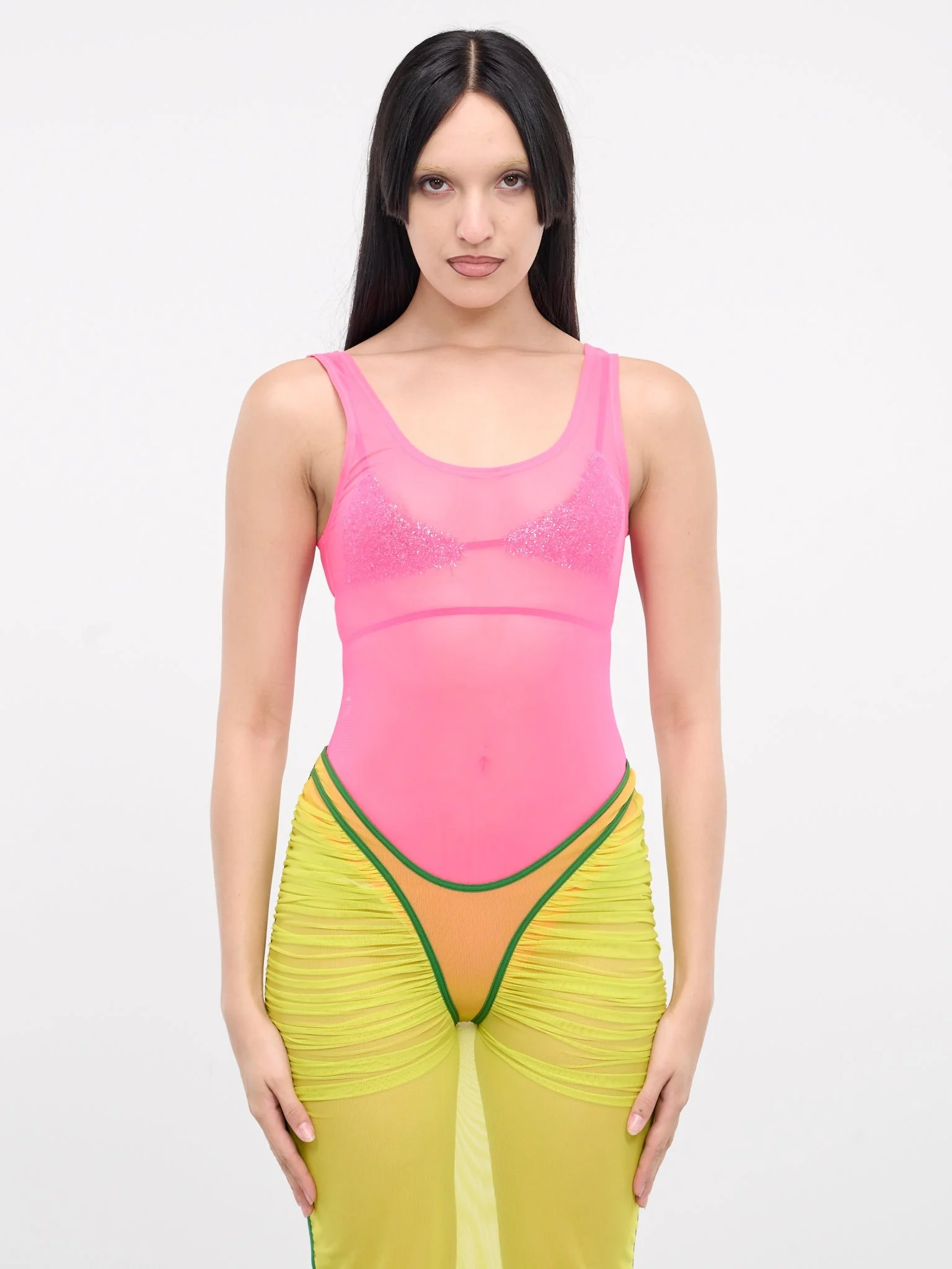 DIESEL bodysuit in pink, paneled construction, semi-sheer, scoop neck, shoulder straps, sleeveless, armscyes, partially open back, mid-cut, form fit. Standard Sizing Model is 5'8" wearing size S. Bust: 32" Waist: 26" Hips: 34.5"