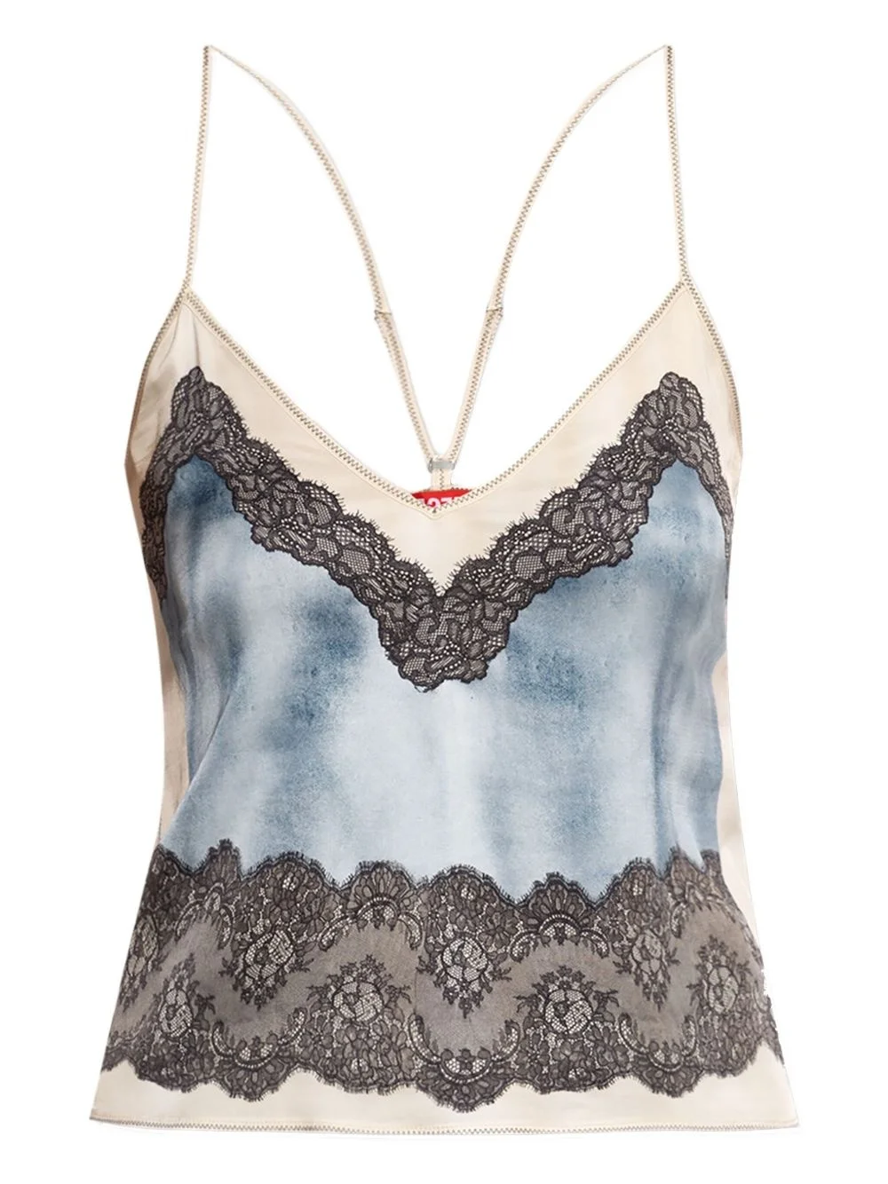 T-Asty top Highlights - Blue - Adjustable spaghetti straps - V-neck - Straight hem - Floral-lace detailing Imported Composition Viscose 97%, Spandex/Elastane 3% Washing instructions Read Manufacturer Guidelines