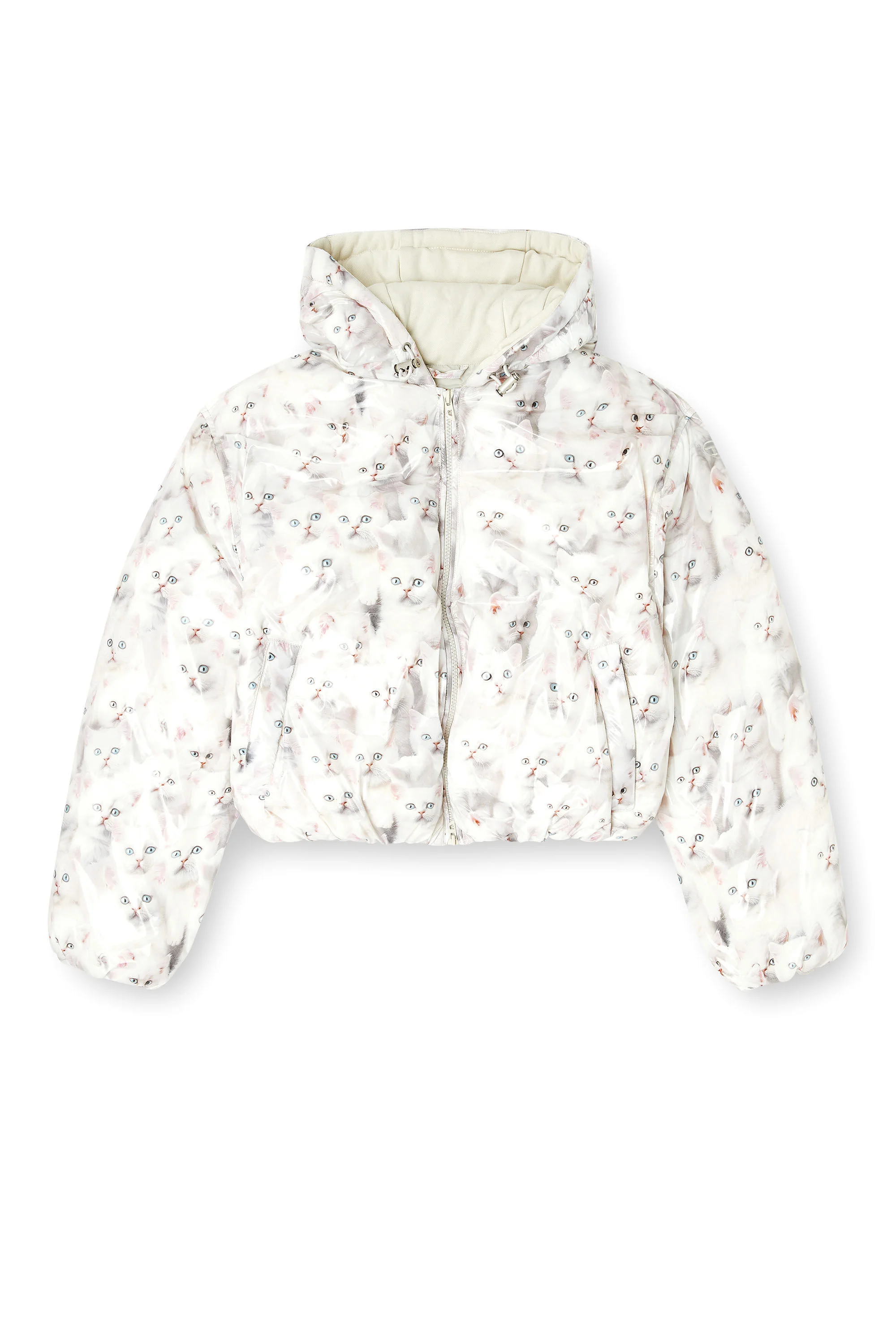 Product Description Printed with fluffy white kittens, this women’s puffer jacket feels playful and optimistic. It’s made from glossy coated nylon and packed with padding for winterproof insulation. The two-way zip and drawstrings at the hood and hem adjust the silhouette for maximum comfort. ID: A196020WFCH Size & Fit Model is wearing an IT size 40 and is 175 cm / 5'7'' Check the size chart to choose the correct size. Materials & Details Composition: 100%Polyamide-Nylon, Coating 100%Polyurethane Regular fit Drawstring hood and hem Zip pockets Two-way zip closure Lined and padded