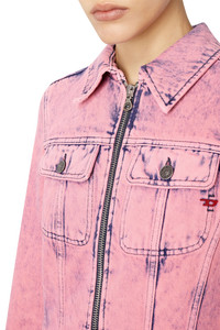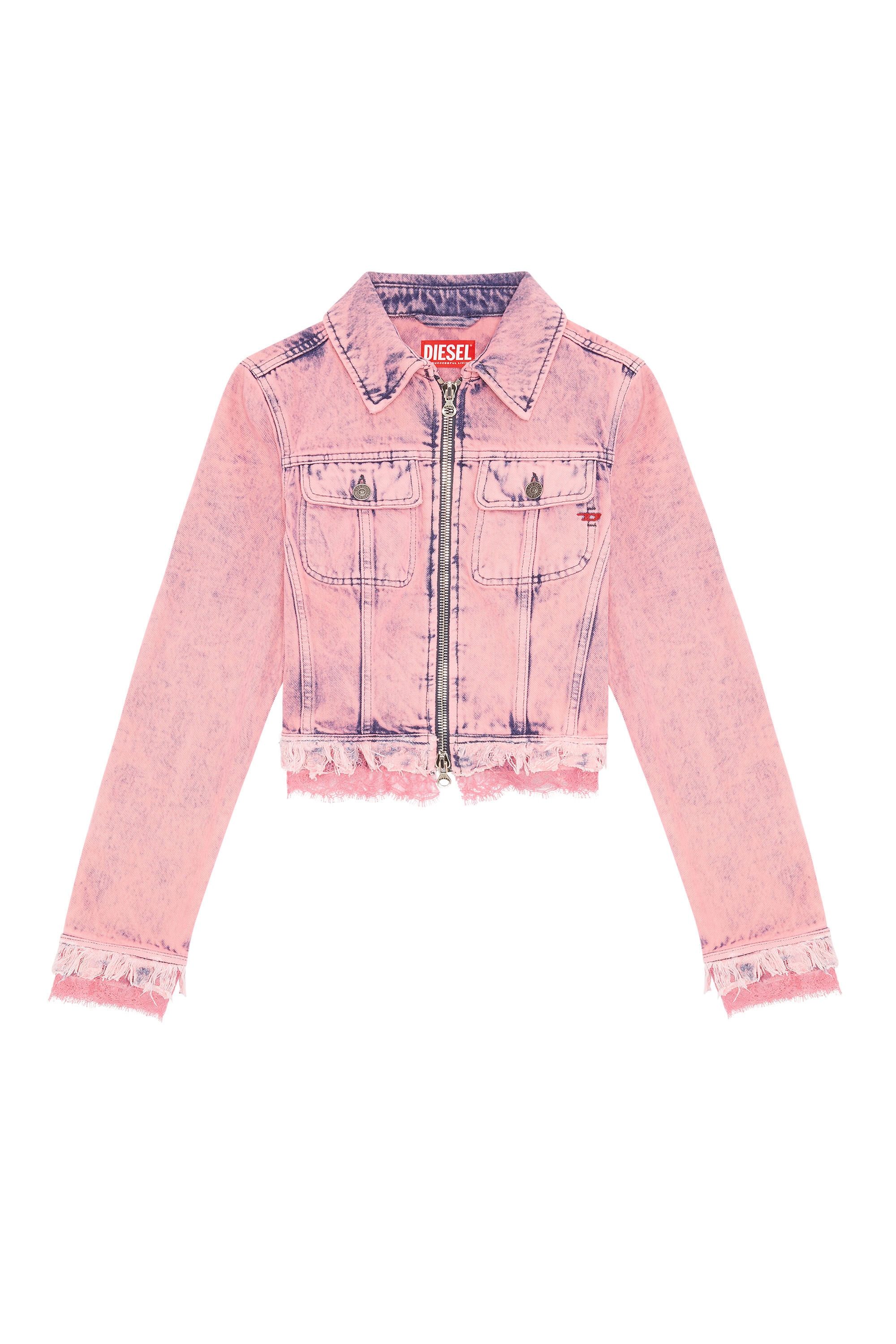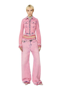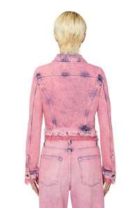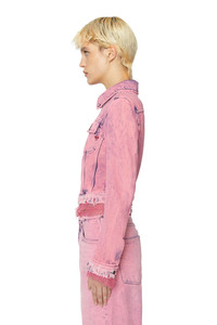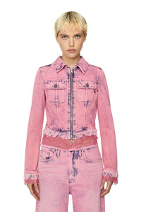 PRODUCT ID: P0100109F93 - 100%Cotton - Application 100%Polyamide-Nylon - DIESEL x THE WEBSTER capsule collection - Cropped, slim fit - Chest flap pockets - Two-way zip closure Model is wearing a size S and is 175 cm / 5'7'' Fits true to size, take your normal size. This women's trucker jacket is part of the DIESEL x THE WEBSTER capsule. Crafted from denim with a lived-in pink wash, it features raw, frayed edges and delicate lace trims. The cropped, fitted silhouette is updated with a two-way zip fastening.
