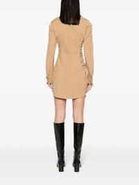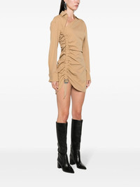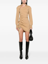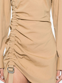 asymmetric gathered mini dress Highlights - Camel brown - Cotton blend - Poplin texture - Ruched detailing - Decorative buckle detail - Spread collar - Asymmetric neck - Fitted waistline - Concealed side zip fastening - Long sleeves - French cuffs - Thigh-length - Asymmetric hem - Unlined Made in France Composition Cotton 60%, Polyamide 35%, Elastane 5% SIZE & FIT Model measurements Height 5 ft 10 in(1.78 m) Bust/Chest 33.46 in(85 cm) Hips 36.22 in(92 cm) Waist 23.22 in(59 cm) FittingInformation Designed for a slim fit that sits just away from the body offering a close yet comfortable fit Made from a midweight stretch fabric, this piece offers elasticity and flexibility when worn This piece fits true to size – take your usual size Washing instructions Dry Clean Only