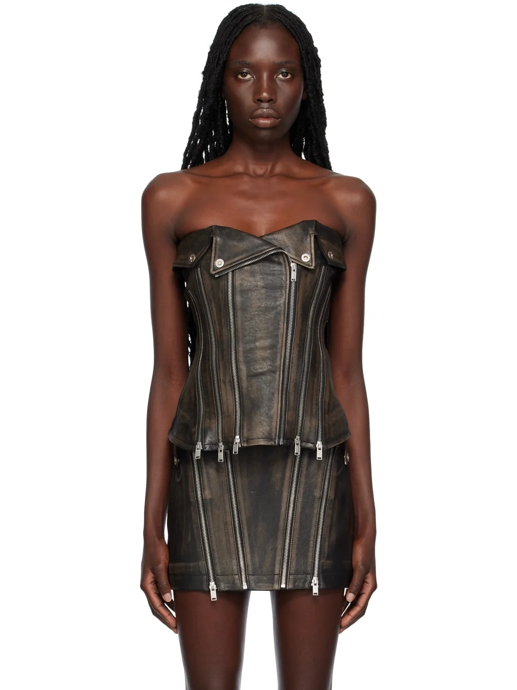 Hand-treated grained leather tank top. Zip detailing throughout. · Sweetheart neck · Press-stud fastening at chest · Offset zip closure · Pinched seams at back Supplier color: Burnished black Body: 100% leather. Lining: 50% cotton, 45% polyester, 5% elastane. Made in Turkey 232417F111000