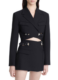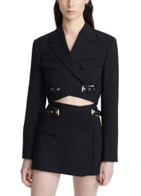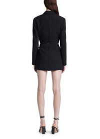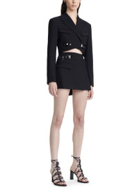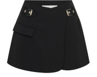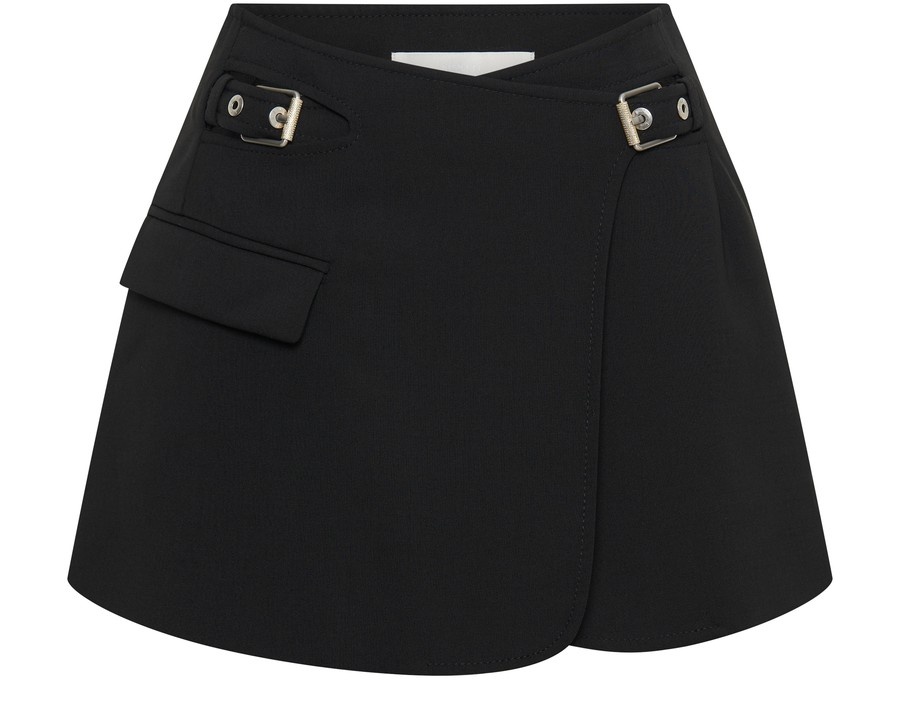 DESCRIPTION - silver finish - logo at the back label - belt loops - back darts - mini - side pockets - flap pockets DETAILS AND CARE MATERIAL: 52% polyester / 41% laine / 4% élasthanne / 3% polyamide COLOR: black COUNTRY OF MANUFACTURE: Turkey PRODUCT CODE: DLECS35SBCKTOA1100 Model Wears Size 8