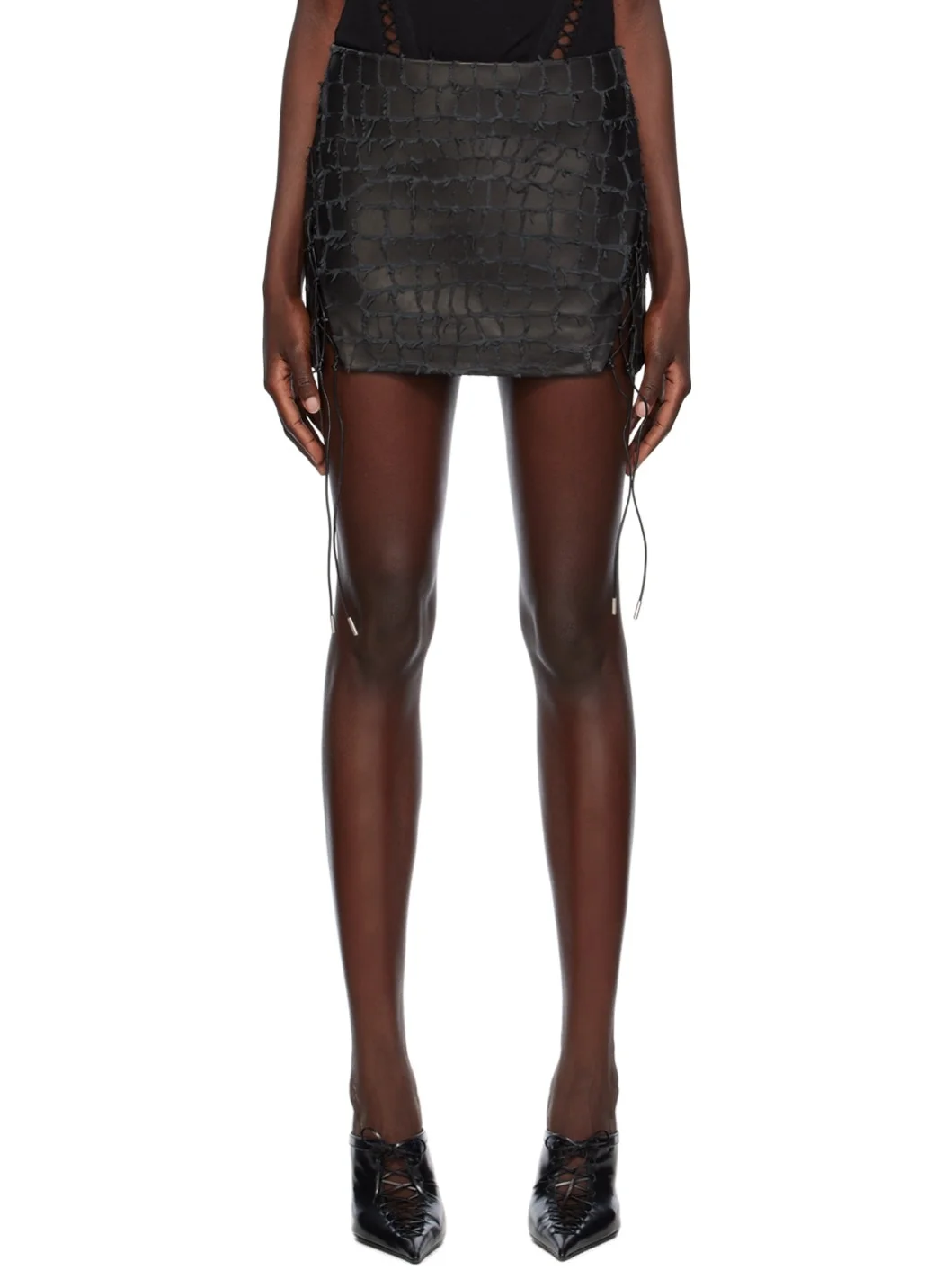 Grained lambskin skirt. Frayed edges and etched snake pattern throughout. · Vented side seams with self-tie fastening · Zip closure at back · Logo-engraved silver-tone hardware · Fully viscose satin lining Supplier color: Black Body: 100% leather. Lining: 100% viscose. Made in Turkey 232417F090005