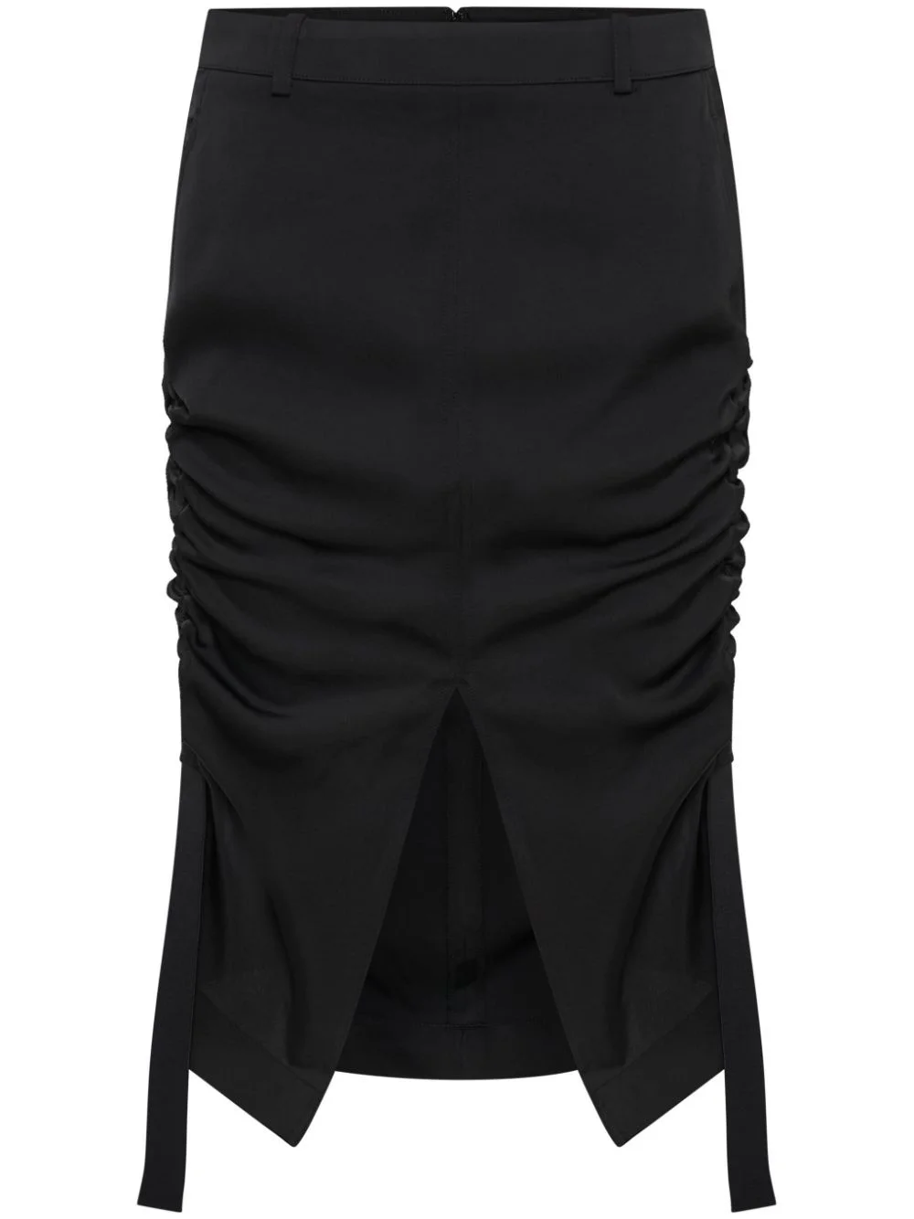 Cinch midi skirt Exhibiting the label's avant-garde aesthetic, Dion Lee presents this midi skirt for its SS24 collection. Crafted from black satin, the mid-rise style boasts internal snaps for ruched styling. Highlights - Black - Satin finish - Draped design - Ruched detailing - Front slit - Slip pockets to the sides - Concealed rear zip fastening - Asymmetric hem - Calf-length Imported Composition Polyester 100%