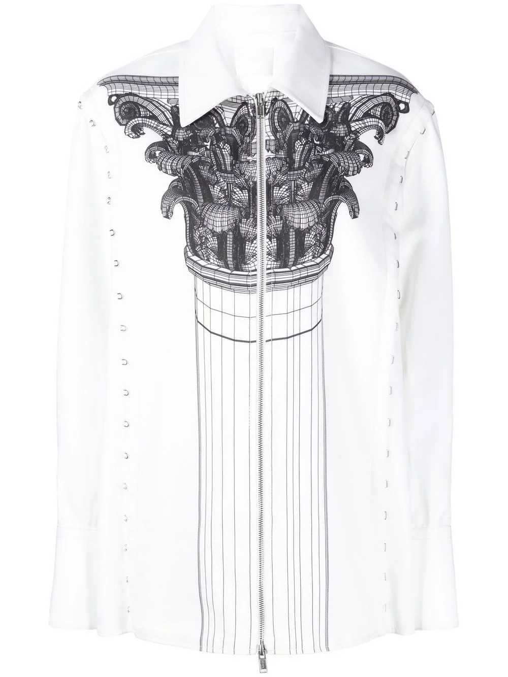 Column-print hook-and-eye shirt jacket white/black cotton graphic print to the front hook and eye detailing pointed flat collar front zip fastening extra-long sleeves buttoned cuffs straight hem Imported Composition Body: Cotton 100% Washing instructions Dry Clean Only
