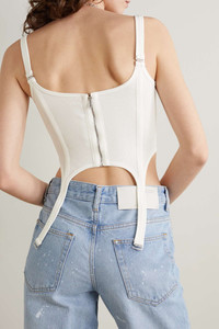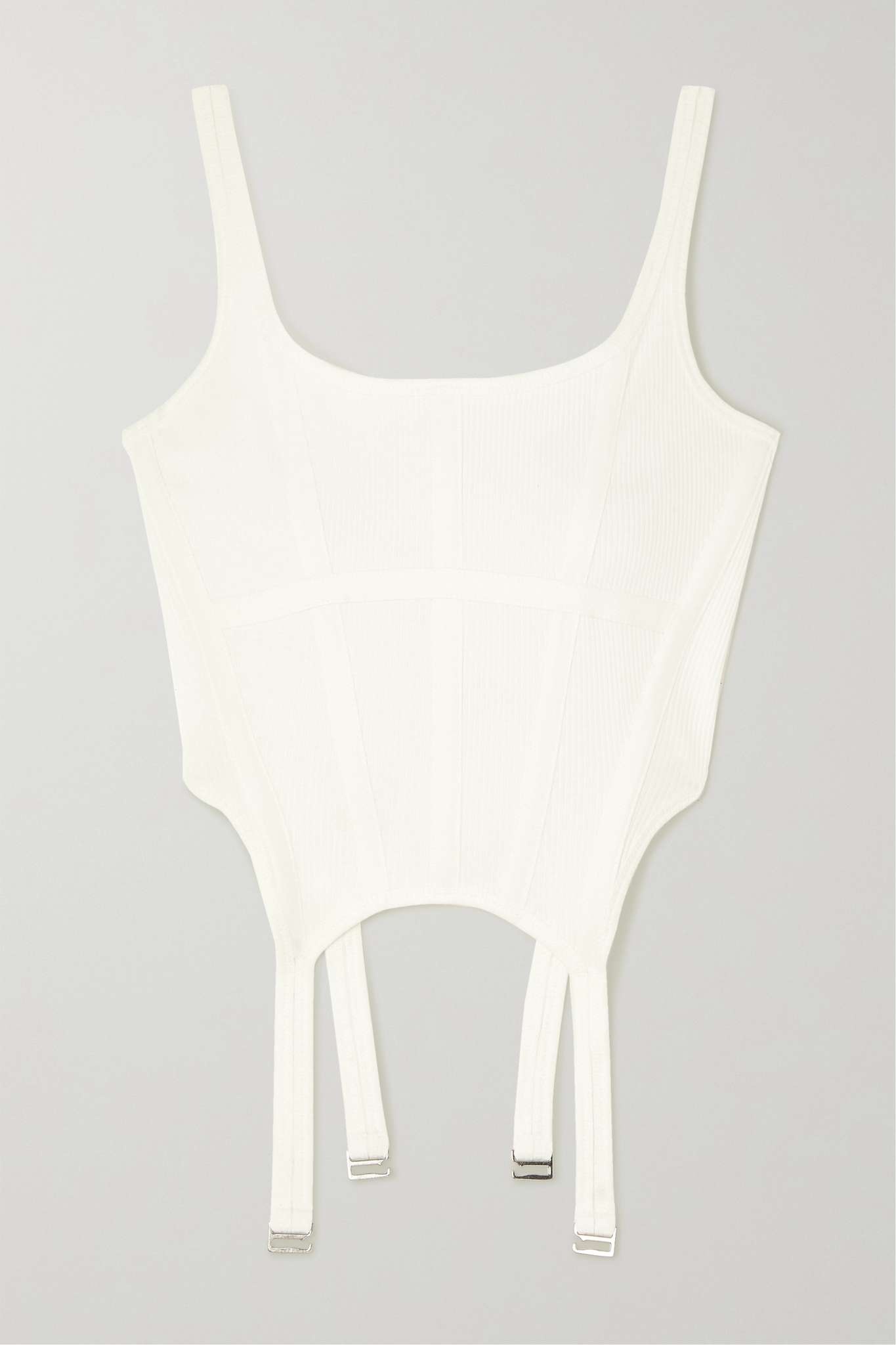 EDITORS'NOTES After presenting her Fall '23 collection 'Second Skin,' Dion Lee told the press that he's not afraid of being sexy. Part of the line-up, this 'Combat' tank top is cut from ribbed stretch-cotton jersey and boned to give it the structure of a corset. The hanging buckles are inspired by vintage garter belts. SIZE & FIT - Fits true to size, take your normal size - Designed for a close fit - Mid-weight, stretchy fabric - Model is 180cm/ 5’11” and is wearing a size XSmall DETAILS & CARE - Ivory stretch-cotton jersey and grosgrain - Hook and zip fastenings at back - 98% cotton, 2% elastane - Dry clean