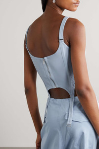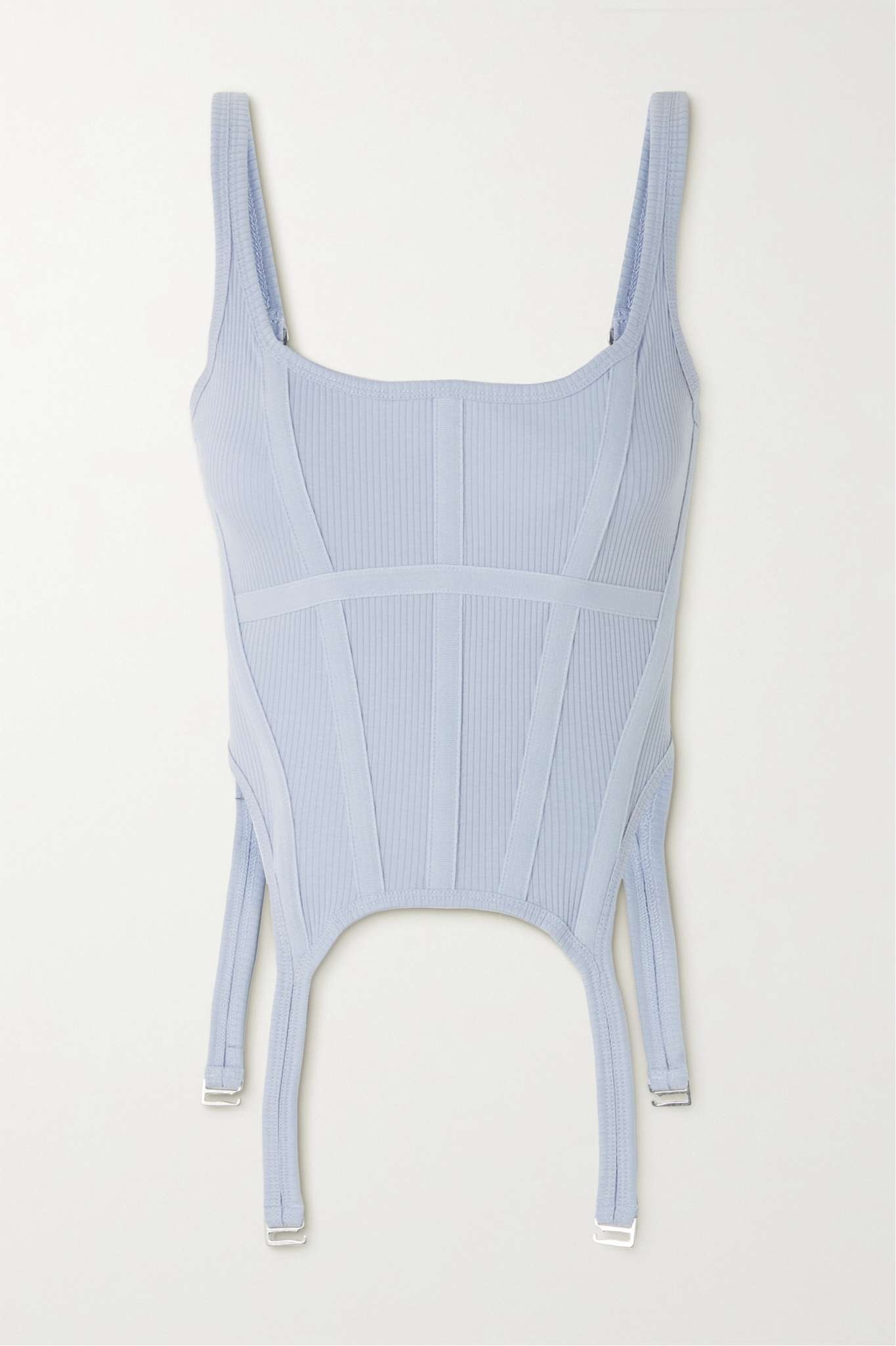 EDITORS'NOTES Dion Lee's 'Combat' tank combines a simple style with classic corsetry. Made from ribbed stretch-cotton, it has exposed canvas piping and a garter-inspired hemline tipped with silver-tone hardware. Wear yours with a pleated mini skirt or wide-leg pants. SIZE & FIT - Fits true to size, however those who are between sizes should take the smaller size - Designed for a close fit - Fine knit - Model is 180cm/ 5’11” and is wearing a size XSmall DETAILS & CARE - Lilac stretch-cotton and canvas - Zip fastening through back - 98% cotton, 2% elastane - Dry clean - Designer color: Glacier