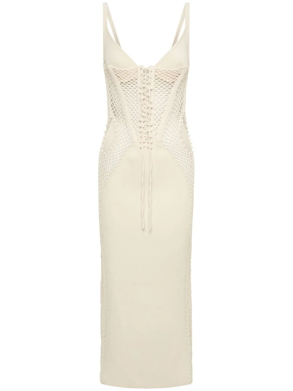 Coral crochet dress cream white cotton blend mesh panelling halterneck spaghetti straps cut-out detailing short rear zip fastening mid-calf length Imported Composition Cotton 64%, Nylon 36% SIZE & FIT Measurement BUST 12.59 in(32 cm) HIPS 16.73 in(42.5 cm) LENGTH 42.59 in(108.2 cm) WAIST 12.2 in(31 cm) Washing instructions Dry Clean Only